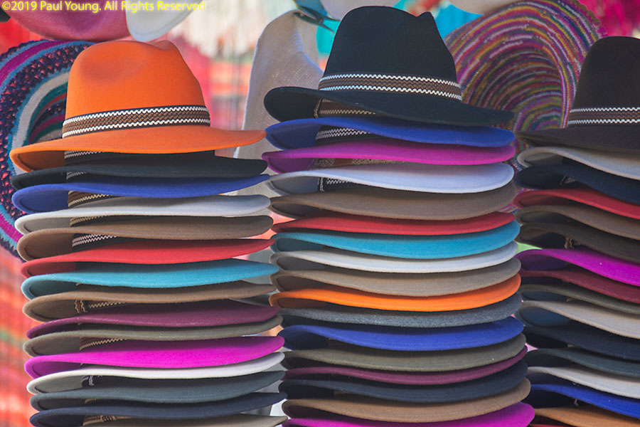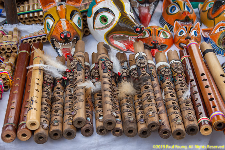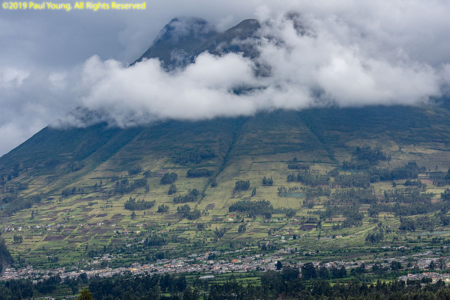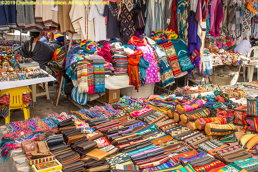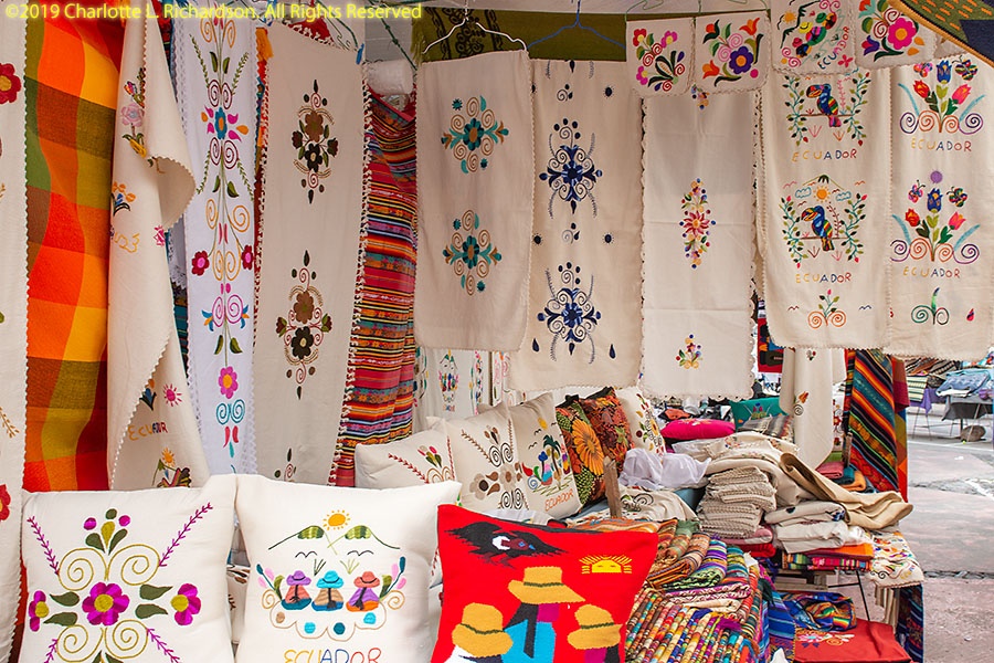 Otavalo has a population of around 39,000, mostly indigenous Otavalo, and lies at an elevation of 8300'. The indigenous people are famous for weaving textiles, mostly wool. Women tradtionally wear white embroidered blouses with flared lace sleeves and black or dark overskirts with cream or white underskirts. Men wear white trousers and dark blue ponchos. The handicraft market of Otavalo features products made by these indigenous people.