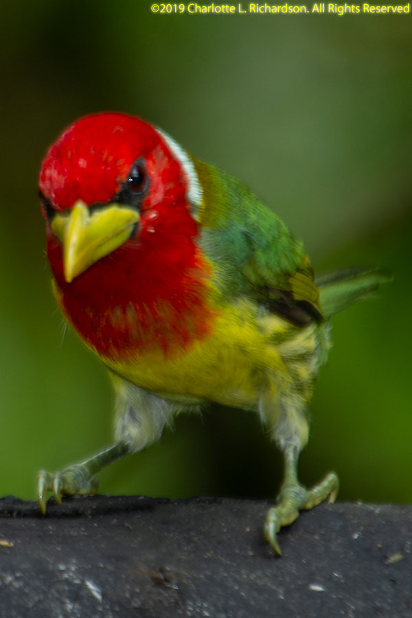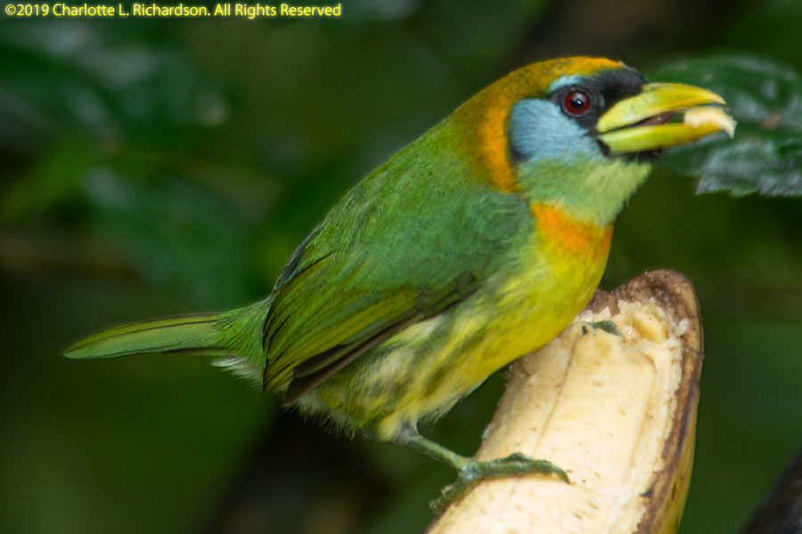 Barbets are plump birds with short necks and large heads. Bristles fringe their heavy bills. Many are brightly colored. Six species are found in Ecuador.