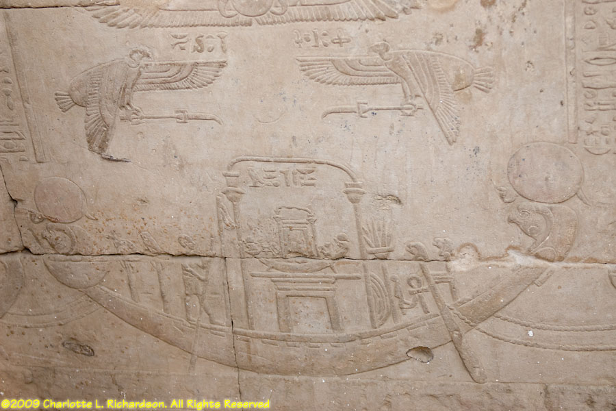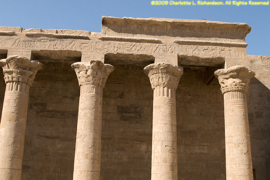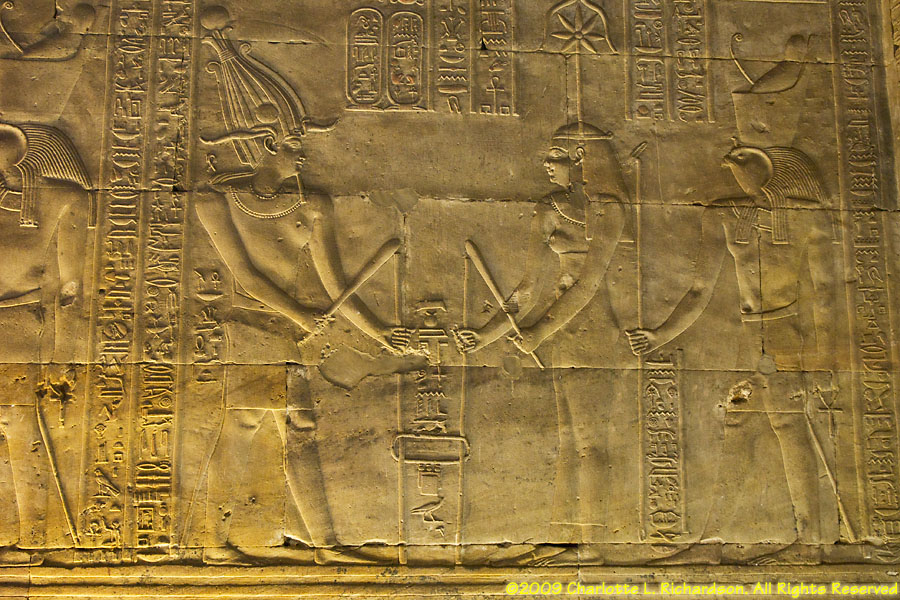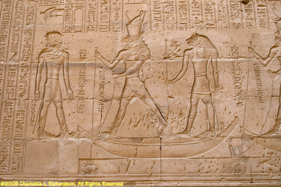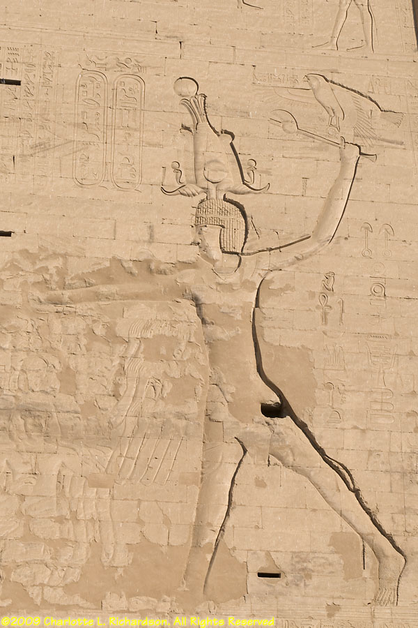 Edfu is halfway between Luxor and Aswan. Its temple of Horus is the largest and best-preserved Ptolemaic temple in Egypt. It was built by the Greeks in the early Egyptian style and completed in 51 B.C.E. The pylon shows scenes of pharaoh Ptolemy XII defeating his enemies.