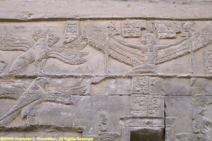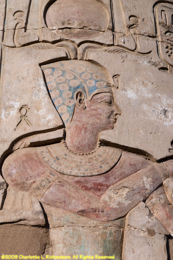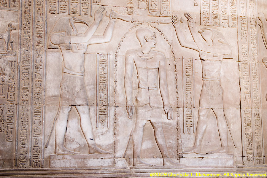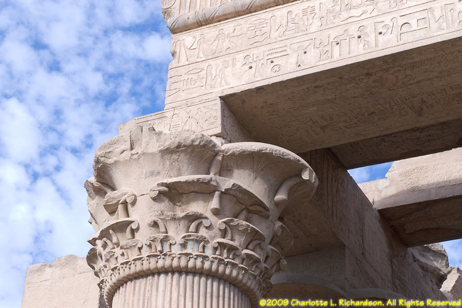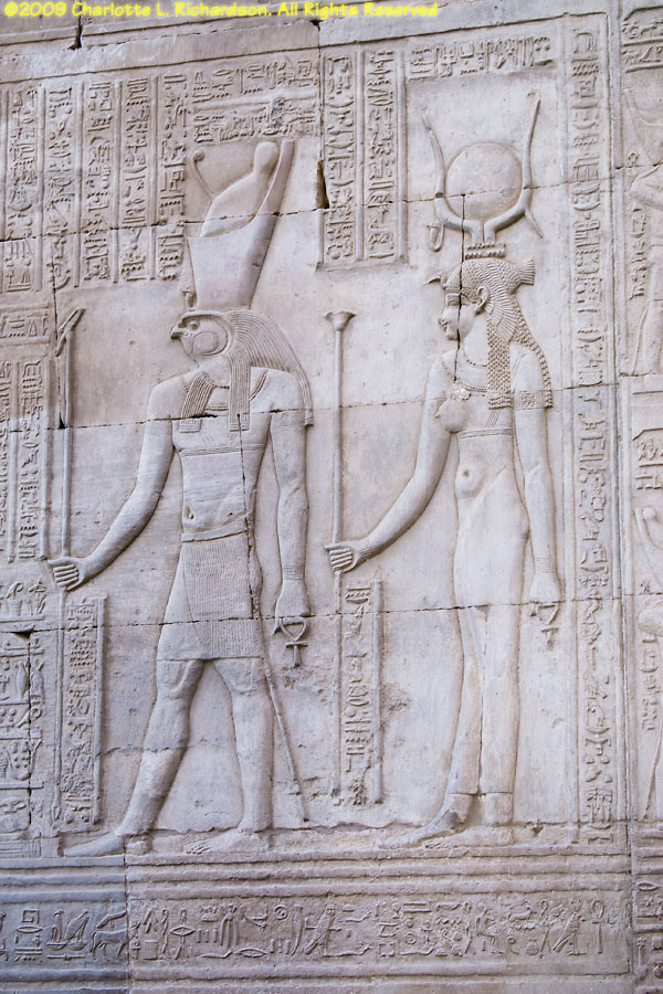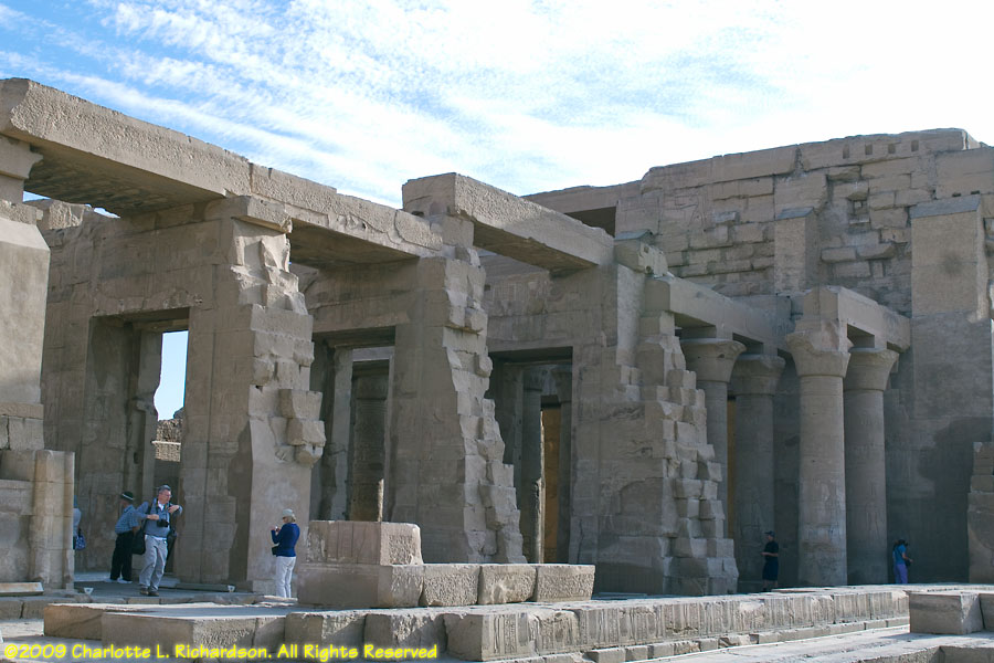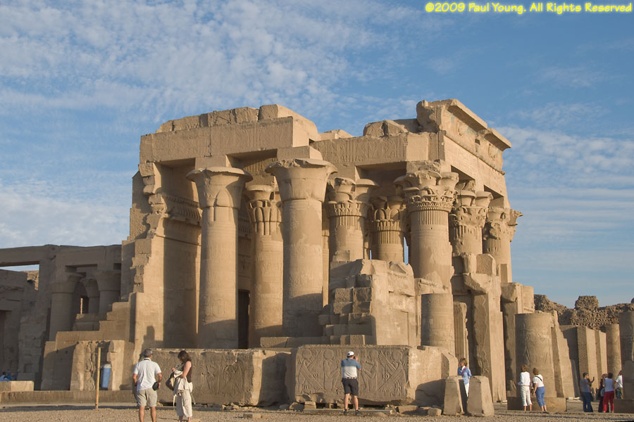 The Greco-Roman Temple of Kom Ombu is 40 km north of Aswan. It is two symmetrical temples side by side. The left side is the temple of the falcon god Horoeris (Horus the Elder). The right side is the temple of Sobek, the local crocodile god. This is one of the few temples still situated on the banks of the Nile. It was begun by Ptolemy VI in the second century B.C.E. and completed by Ptolemy XII in the first century B.C.E. Roman emperor Augustus added the entrance pylon in 30 B.C.E.