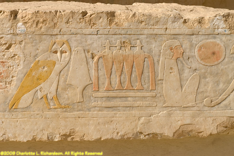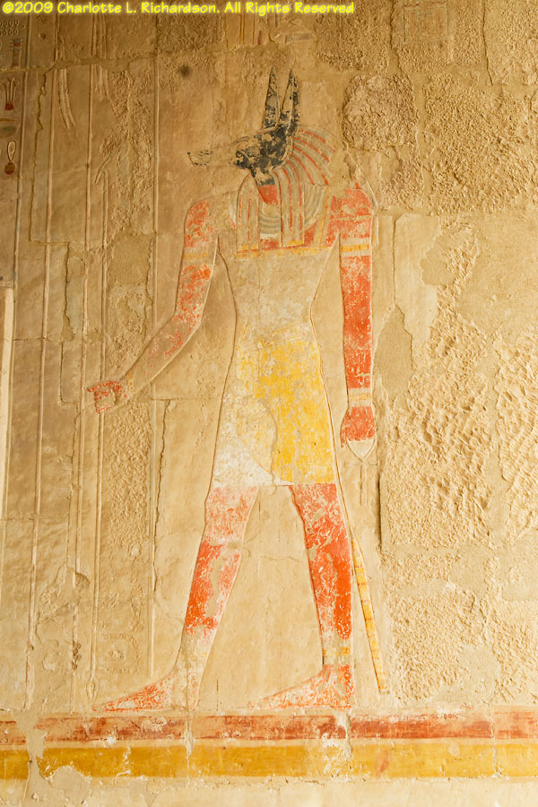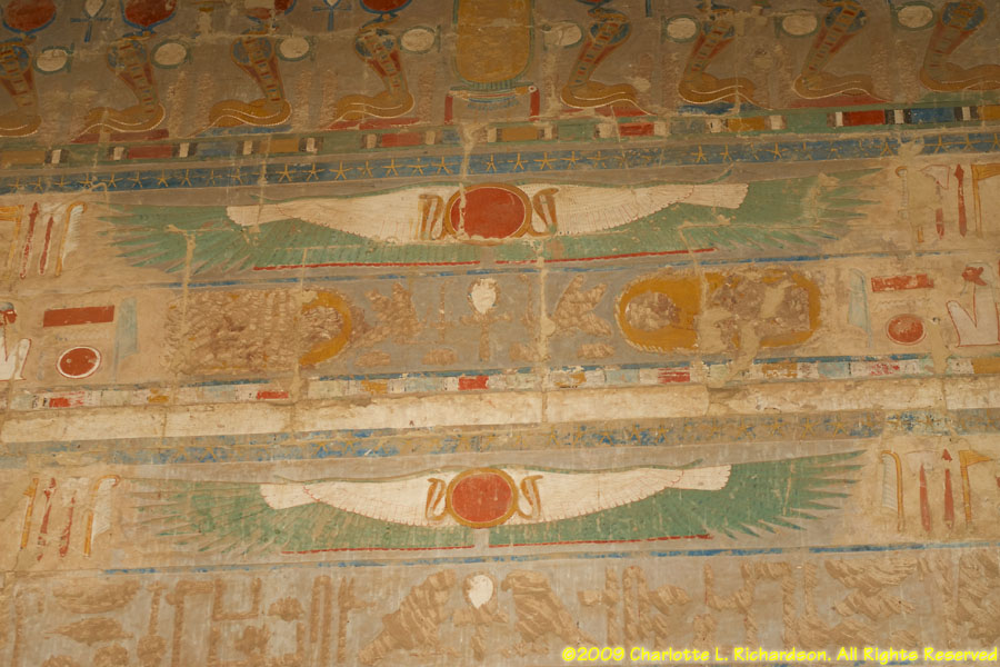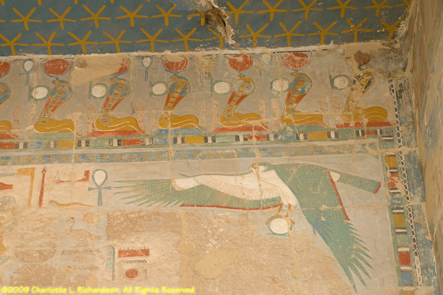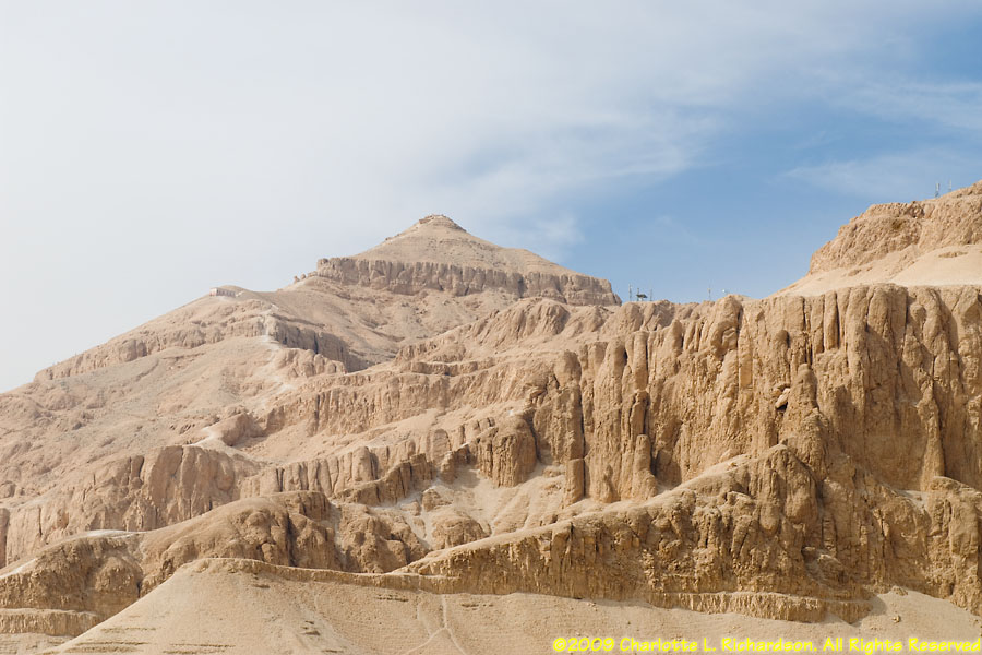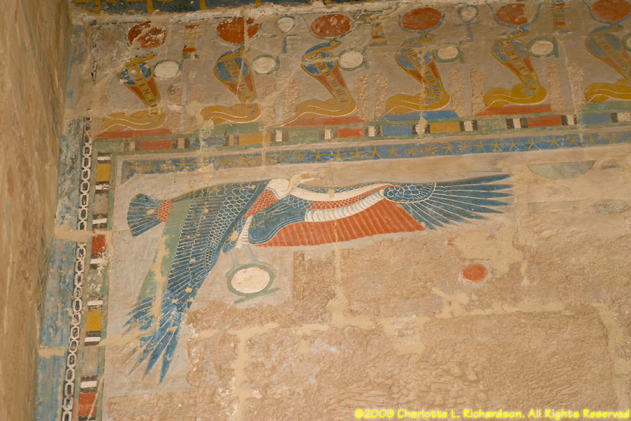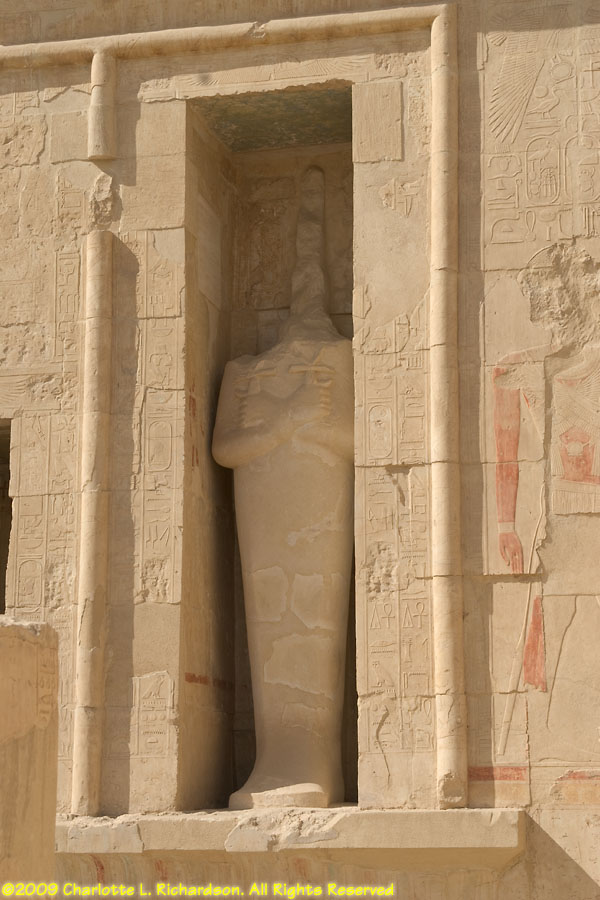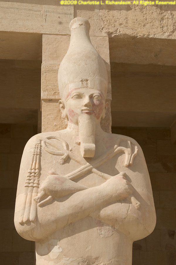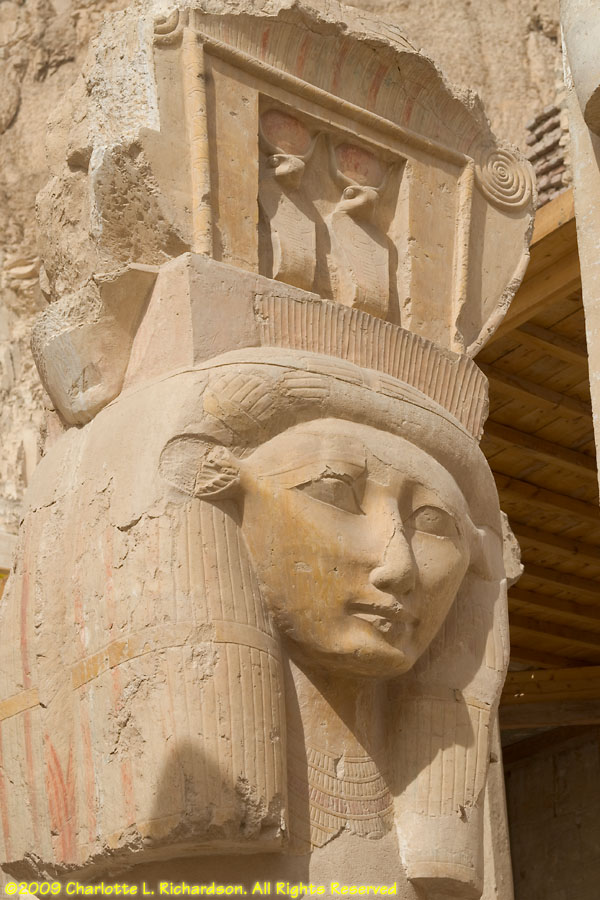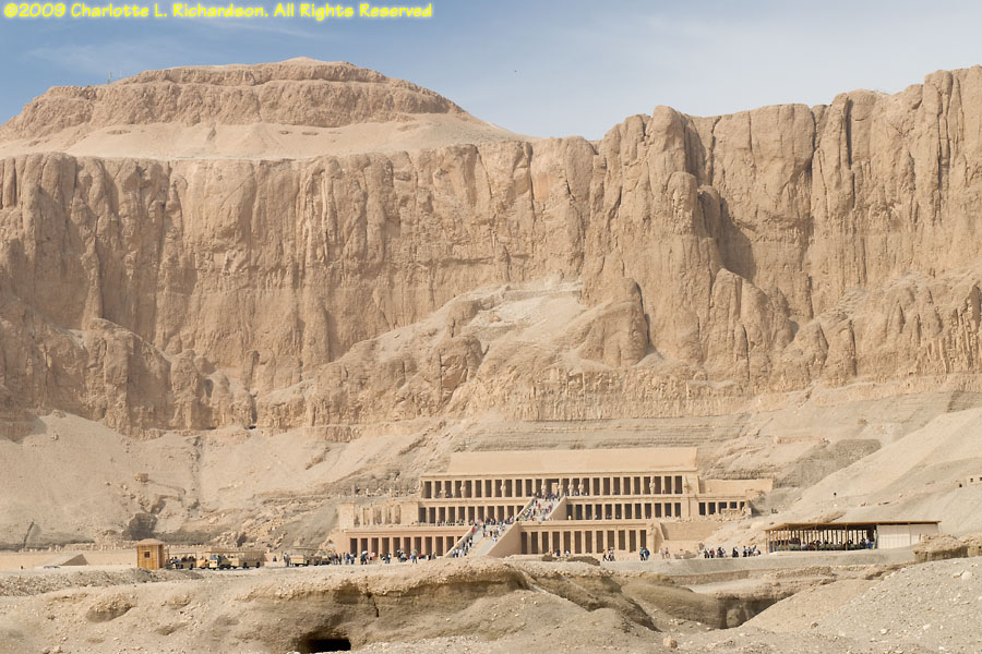 The mortuary temple of Queen Hatshepsut, Egypt's first female pharaoh, in Luxor at Deir al-Bahri is at the foot of a sheer limestone cliff. The pyramid-shaped mountain above the cliff gave the site royal appeal. Inside, the original pigments remain colorful in many of the paintings. An entire wall is devoted to paintings of her expedition to the land of Punt, apparently in the area of Ethiopia on the Red Sea, with her troops in sailing ships, recognizable tropical fish, and the queen of Punt. Hatshepsut lived from c. 1473 to 1458 B.C.E. and was the daughter of Thutmose I. When Thutmose I died, his son Thutmose II succeeded him and married his stepsister Hatshepsut. When Thutmose II died around 1479 B.C.E., his young son Thutmose III became pharaoh, with Hatshepsut as his regent. In 1473 B.C.E., she declared herself pharaoh. She wore a fake beard and male clothing and had herself drawn and treated as a man. She disappeared around 1458 B.C.E. when Thutmose III regained the throne. Next to Hatshepsut's Temple is the ruins of the Temple of Montuhotep II.