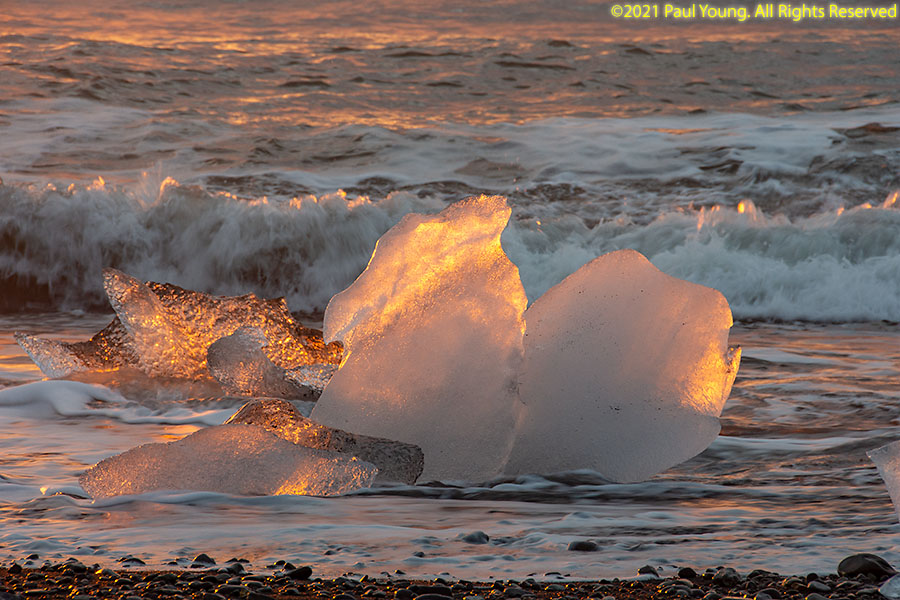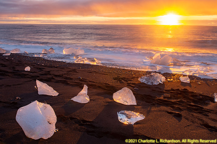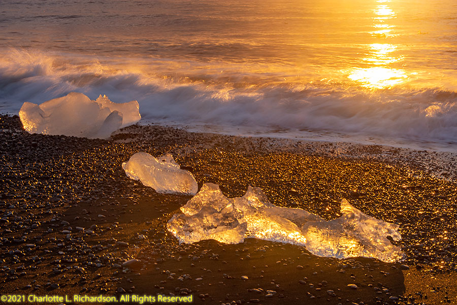 At the mouth of the Jokulsa River, Iceland's shortest, icebergs from Jokulsarlon wash up on the black sand Fellsfjara Beach, called "Diamond Beach".