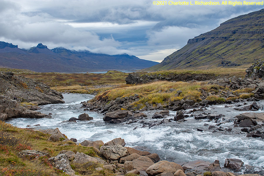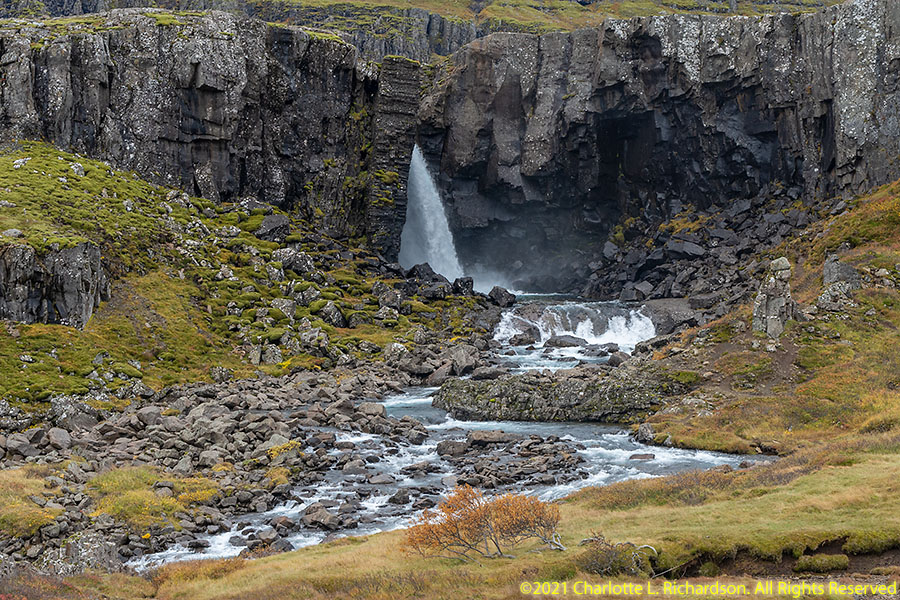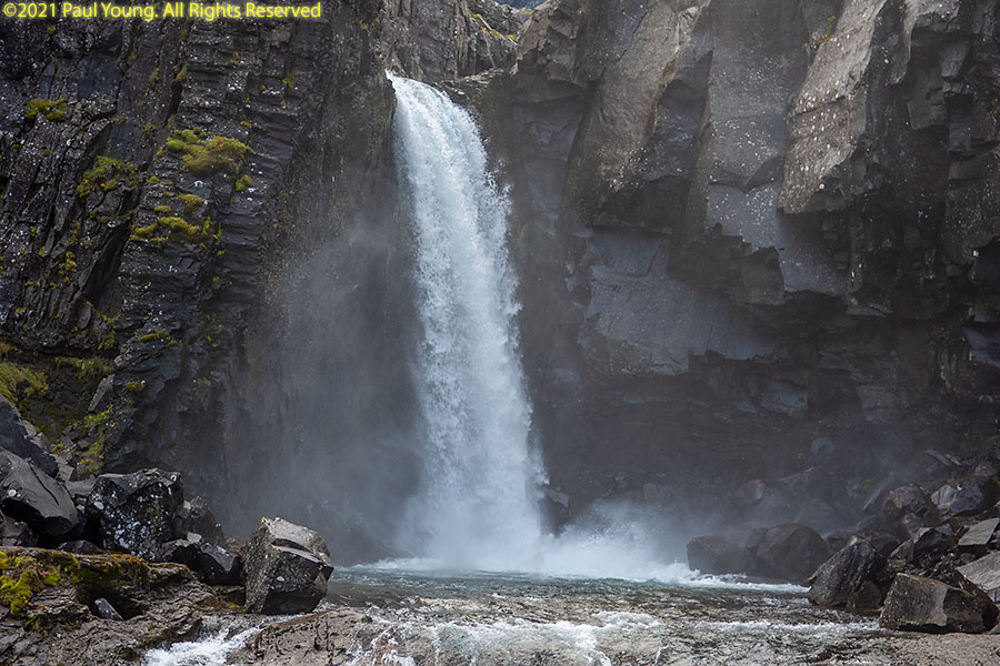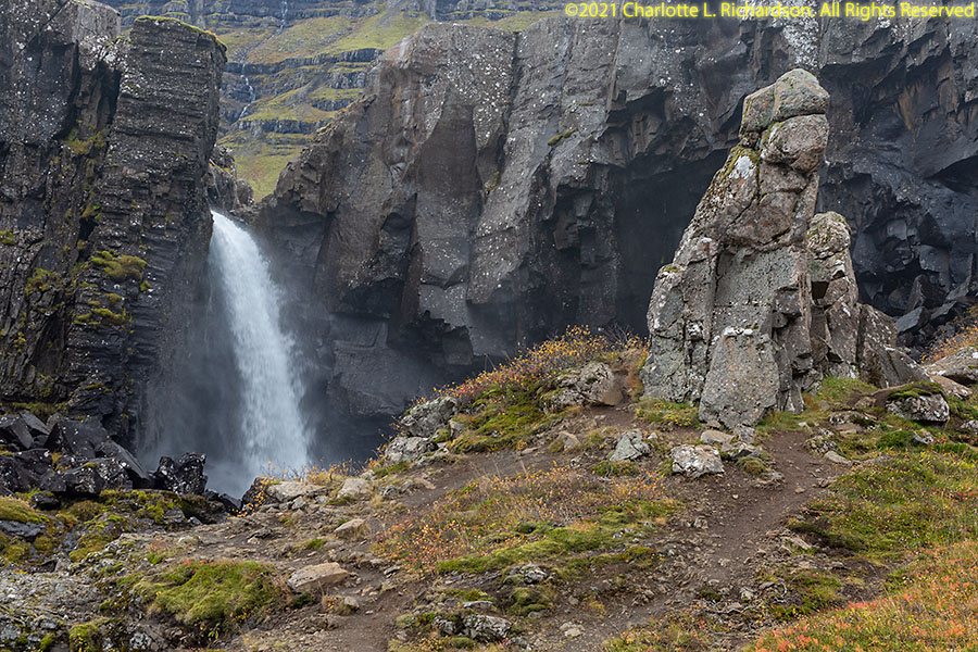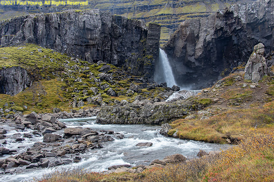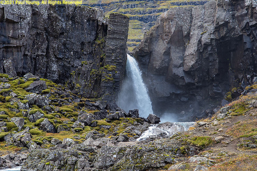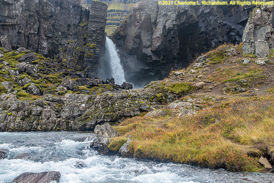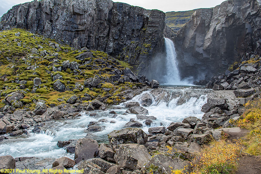 Folaldafoss is the lowest of a series of waterfalls along the Berufjarthara in the East Fjords area of Iceland. Its total height is 16m. The stream flows into the Berufjorthur.