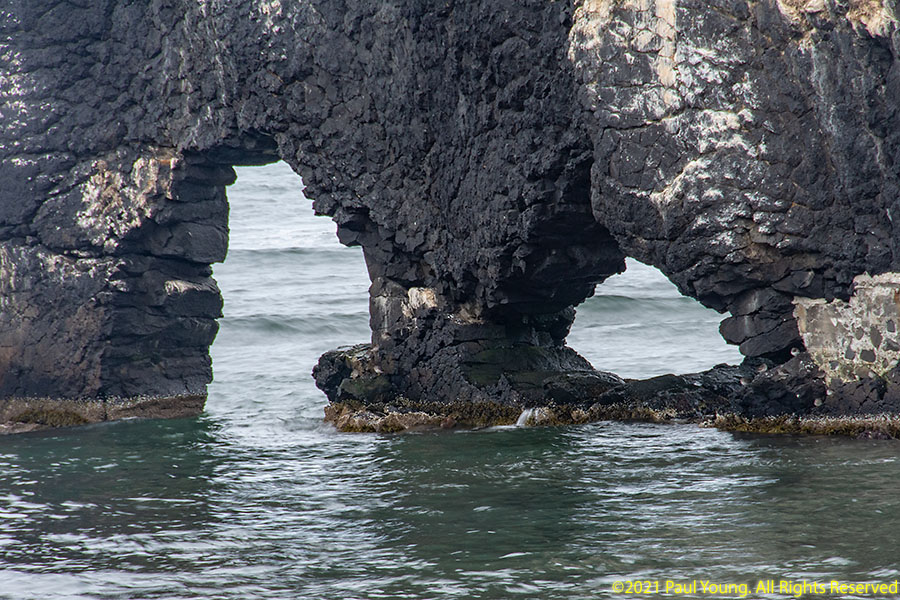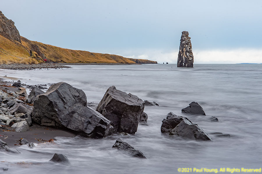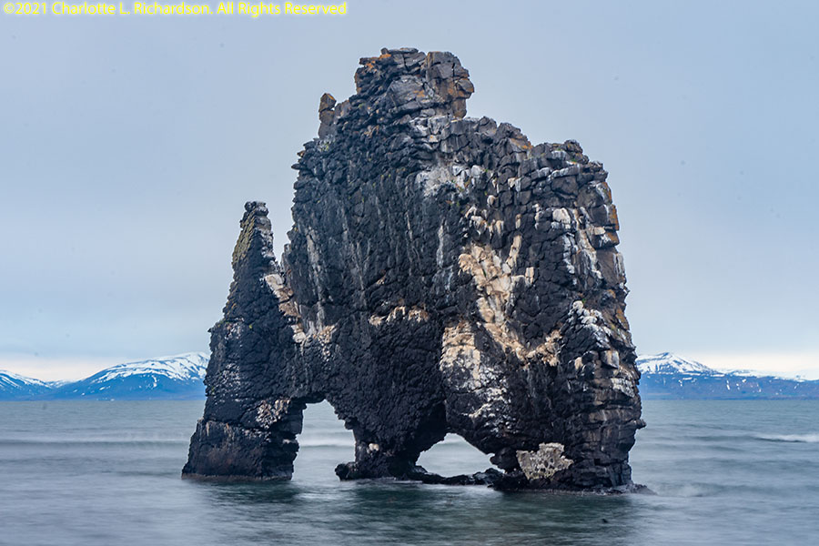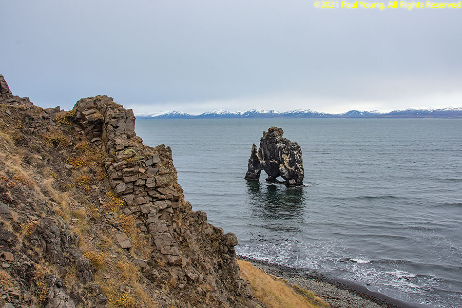 This 15m basalt sea stack is on the Vatnsnes Peninsula's east coast in Northwest Iceland. It is a volcanic basaltic plug. According to legend it was a troll caught by sunlight while attempting to destroy the monastery at Thingeyrar. The base of the sea stack has been reinforced with concrete to prevent collapse. Several bird species nest on the rock, producing the white guano streaks.