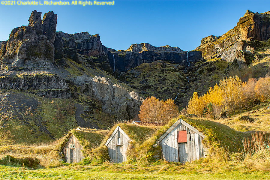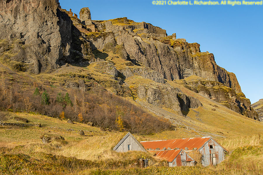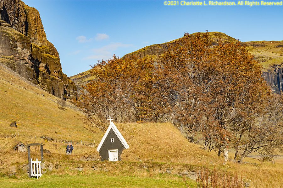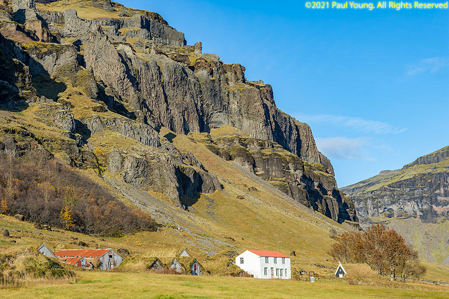 Lomagnupur towers over the turf-roofed farm at Nupsstathur. The buildings date back to the early 19th century. The turf chapel is one of the last turf churches in Iceland and was once a museum. It is the smallest turf-roofed church in Iceland.