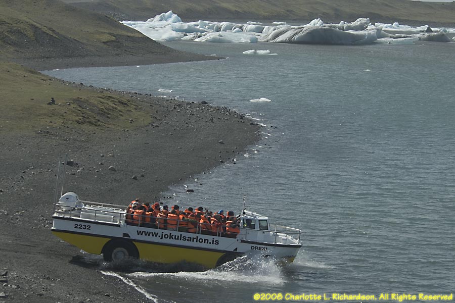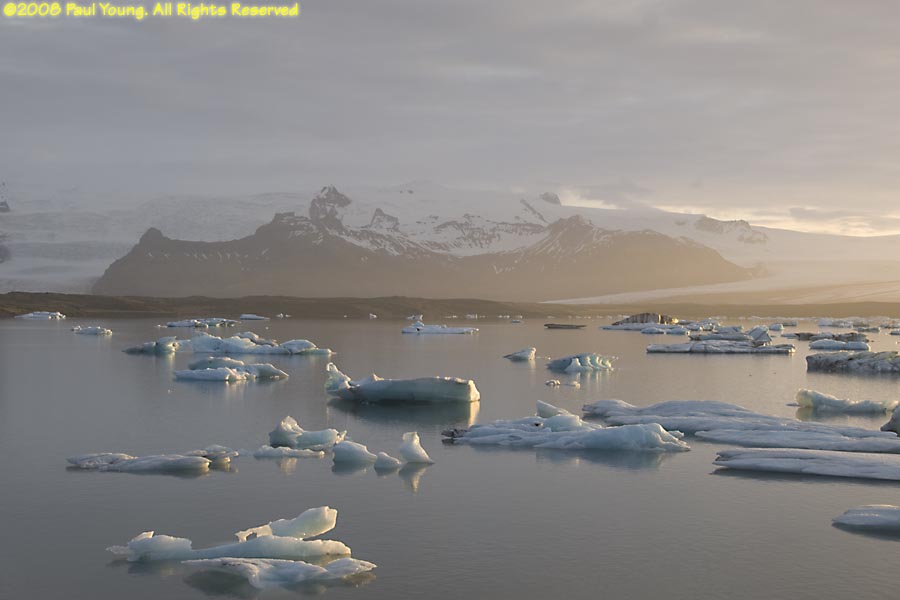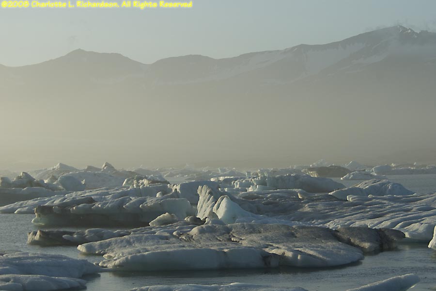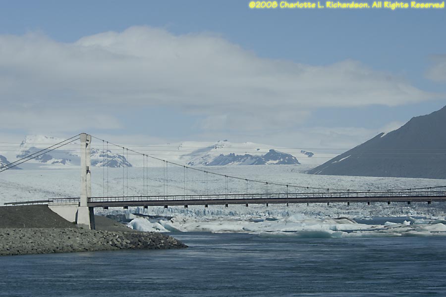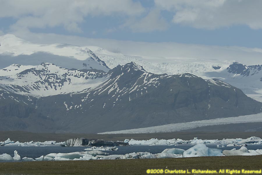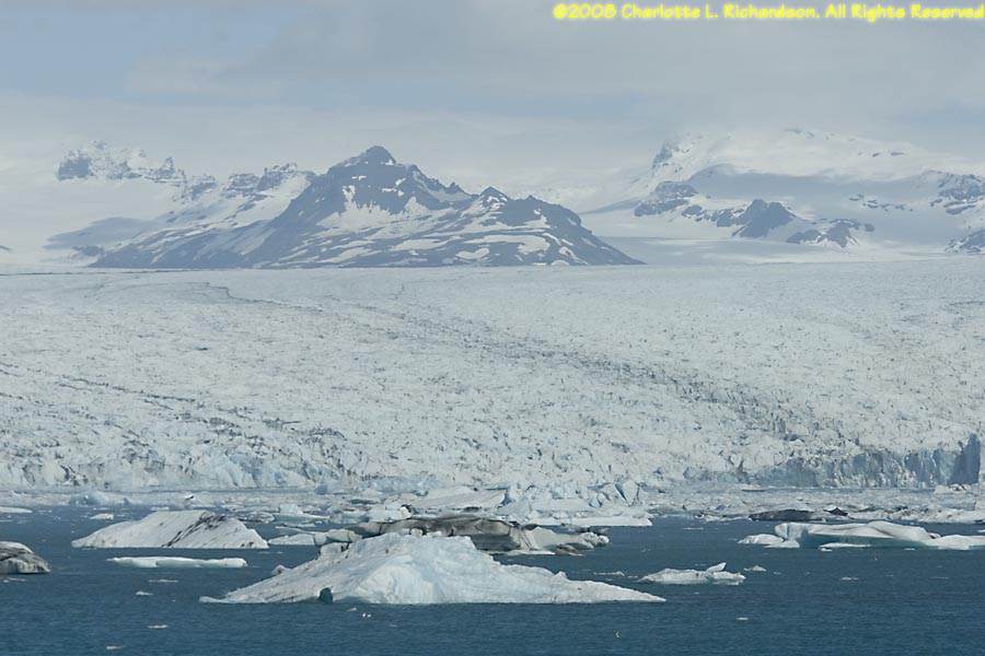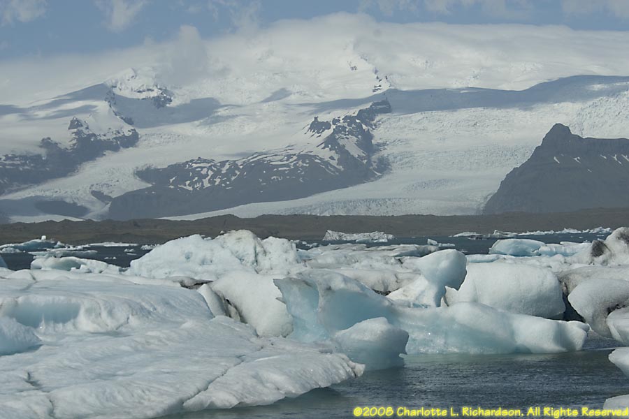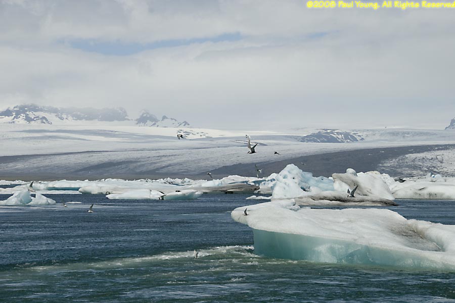 Jokulsarlon glacial lagoon, at the edge of Breidamerkurjokull glaicier, lies in the southeastern part of Iceland. The lagoon is only about one hundred years old, and is expanding so quickly that it threatens the Ring Road. The lagoon is the outer extent of a 20 km fjord extending inland under the glacier.