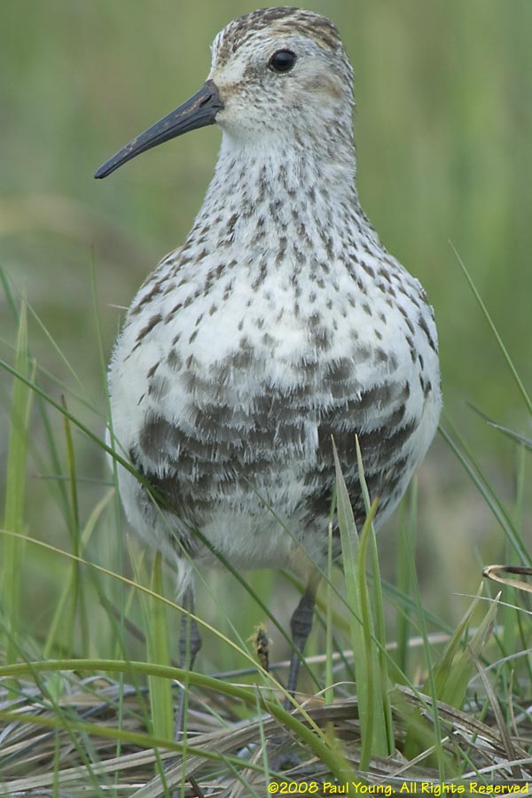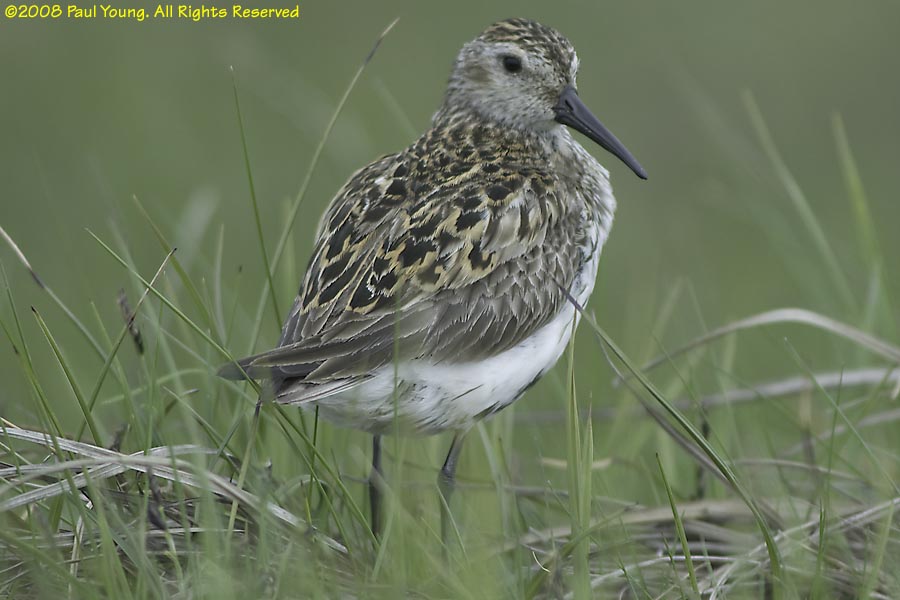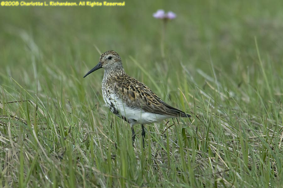 Dunlins (Calidris alpina) are a small wading bird found in marshy areas in the summer.