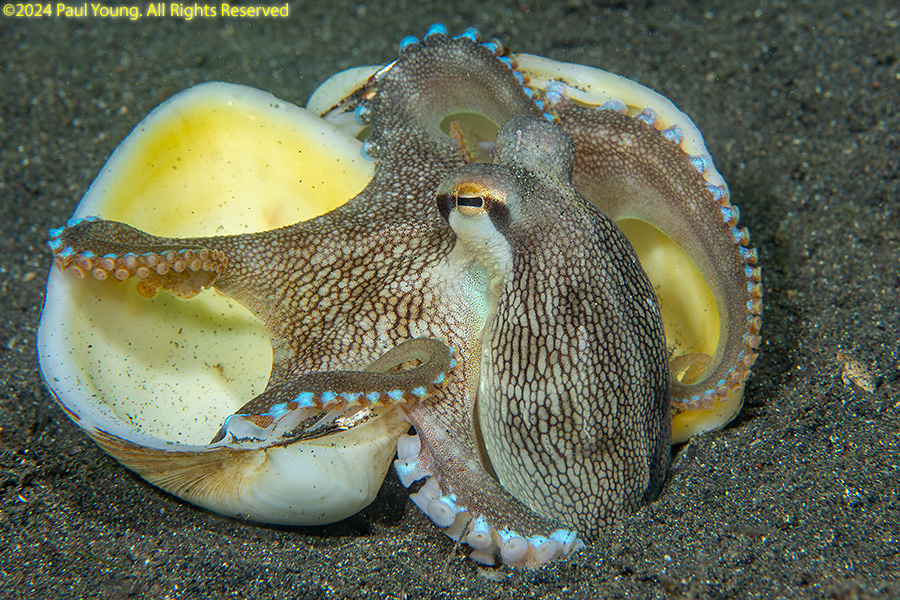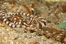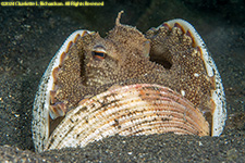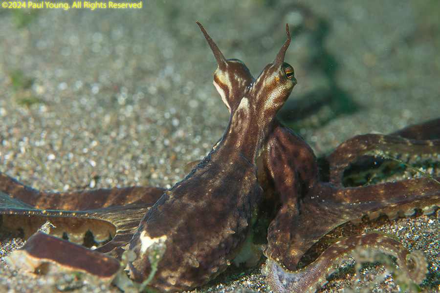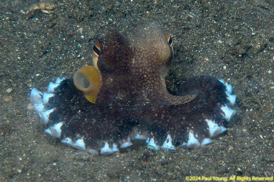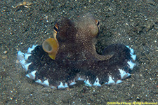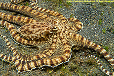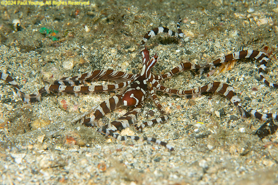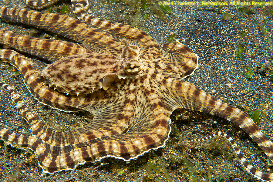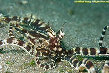 The mimic and wunderpus octopuses are very similar. You can distinguish them because the mimic octopus has a white line under its arms which the wunderpus lacks.