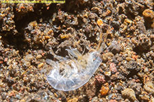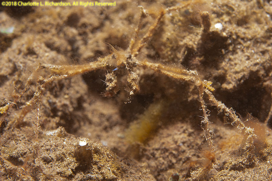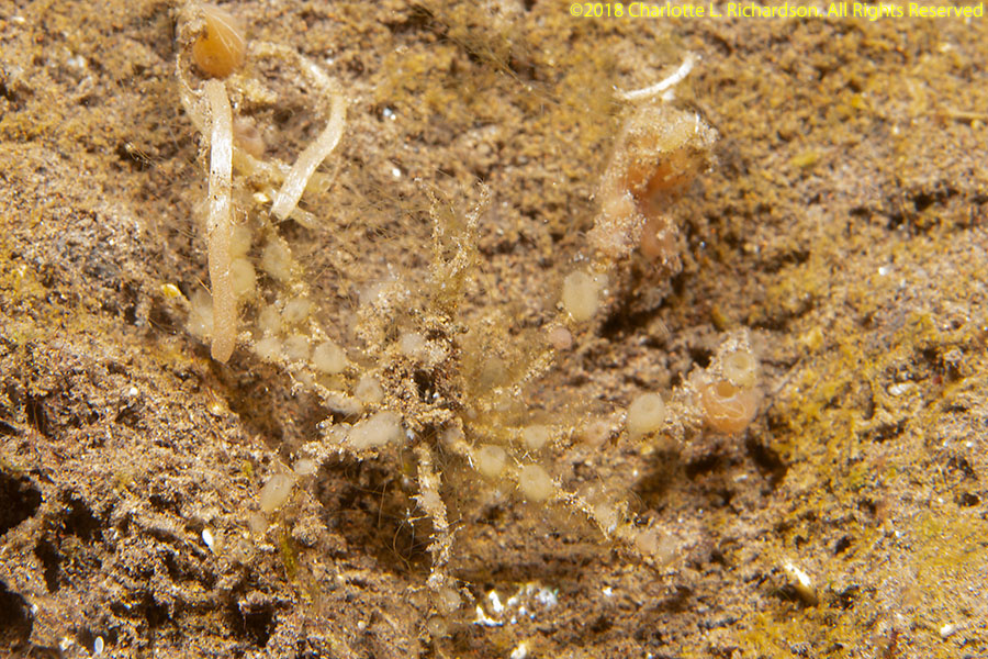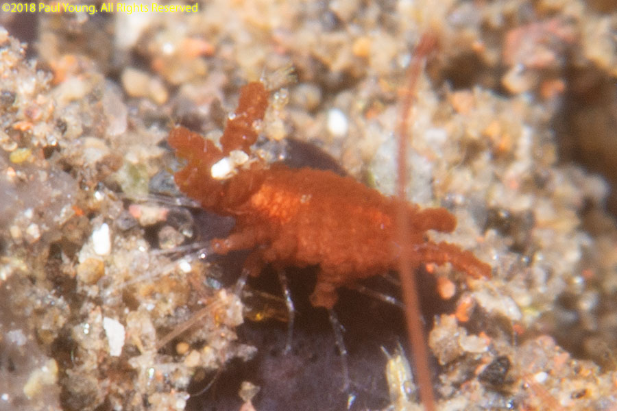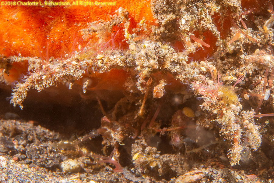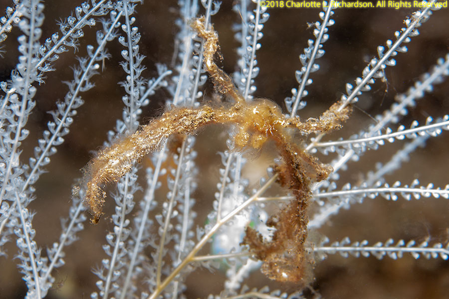 Skeleton shrimp are not true shrimp. They are actually amphipods. They typically live in groups from dozens to thousands. Males are much larger than females. They have long thin jointed bodies with two sets of antennae, large grasping claws, and saclike gills. Instead of legs, backward-facing hooks extend from the last three body segments, allowing them to move much like inchworms. From brooding pouches on their abdomens, females bear live young that cling to their mothers for several weeks.