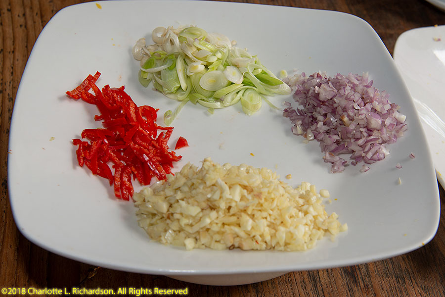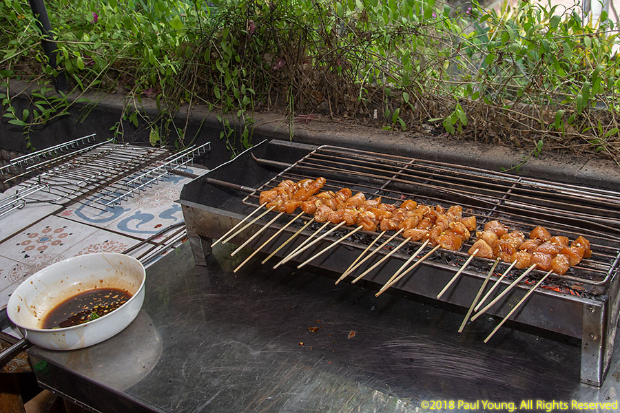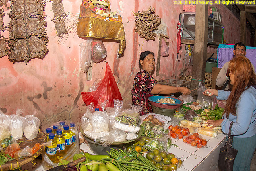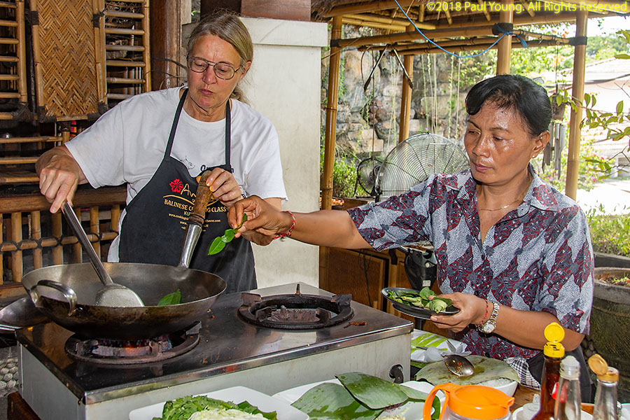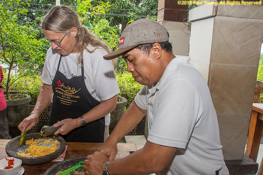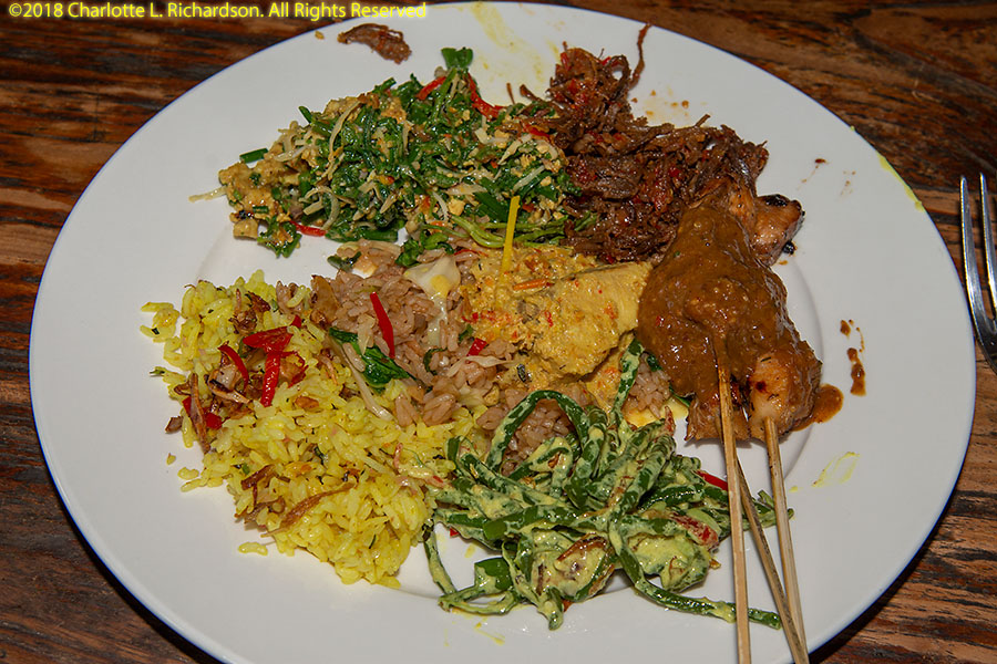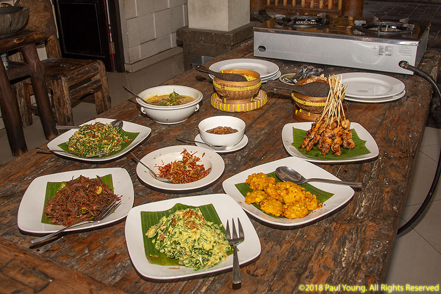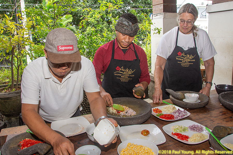 The hands-on, six-hour, Anika Bali Cooking class taught us about the fresh herbs, spices, and other ingredients that make up Balinese food. We visited the market, then prepared and feasted on a complete Balinese menu: fish curry, shredded spiced beef, chicken satay, fern lawar, sweet corn patties, fragrant yellow rice, fried rice (nasi goreng), fruit in coconut milk, and fried bananas.