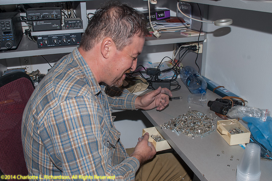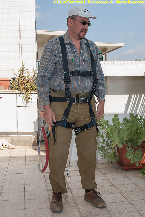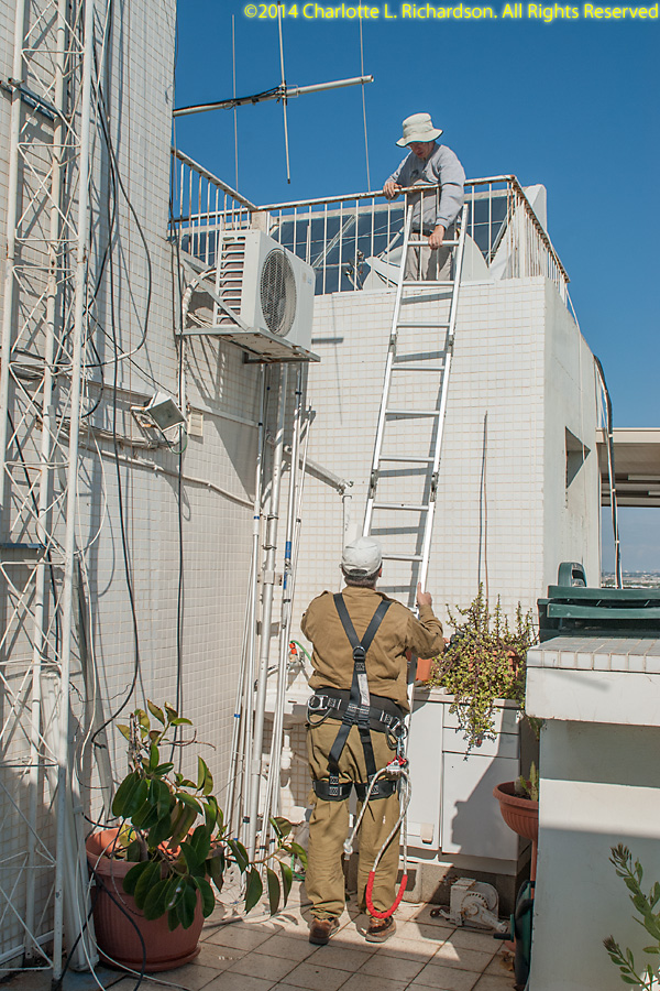 Assembling and installing the new Force12 antenna. Ilya assembled the elements on the rooftop patio, and then attached elements on one end of the boom by attaching the boom to the solar panel roof. Then he and Paul attached elements to the other end, extending the boom up the slope away from the tower, until all elements were in place. Then the antenna was raised up the tower. This job was tougher than it should have been because of missing antenna parts. English-sized bolts are not easy to find in Israel, which uses metric bolts. Ilya has a small stash of English-sized hardware. The replacement bolts shipped from the US came without any nuts or washers, which are, not surprisingly, not any easier to find in Lod than the bolts themselves are. The boom-to-mast clamp was sized for US water pipe and would not quite accept bigger bolts to fit over the bigger Israeli mast, but Ilya was able to drill out the holes a little.