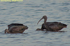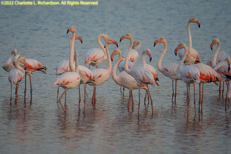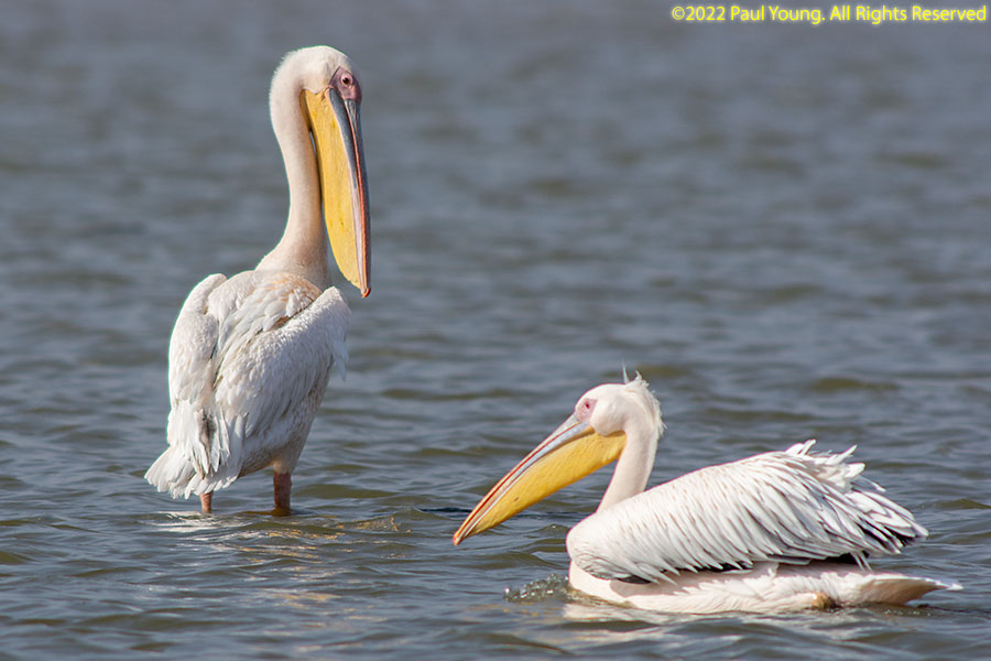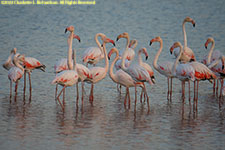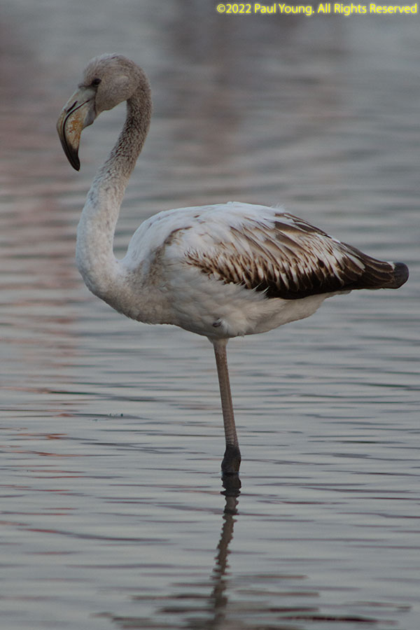 Greater flamingo, Phoenicopterus roseus, adult left, juvenile right