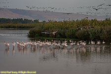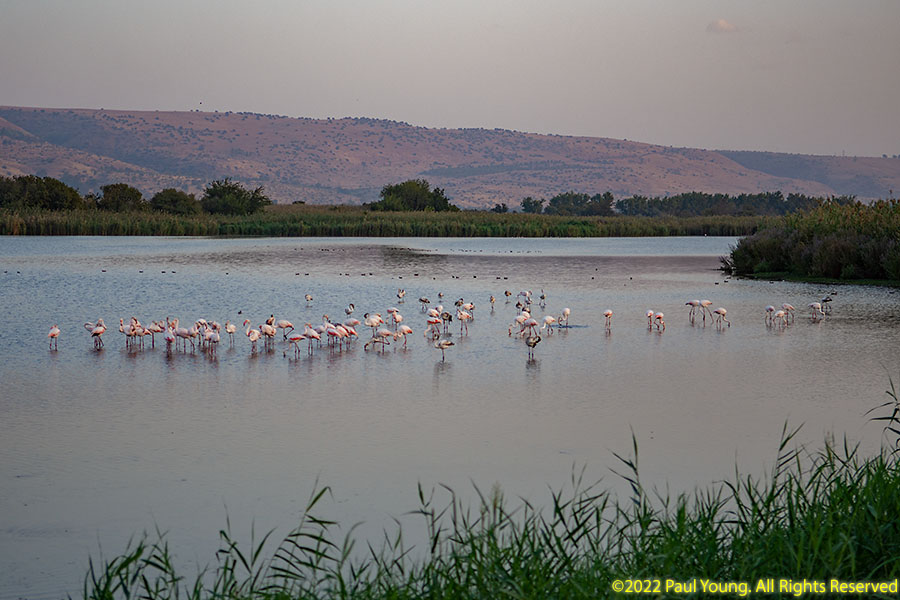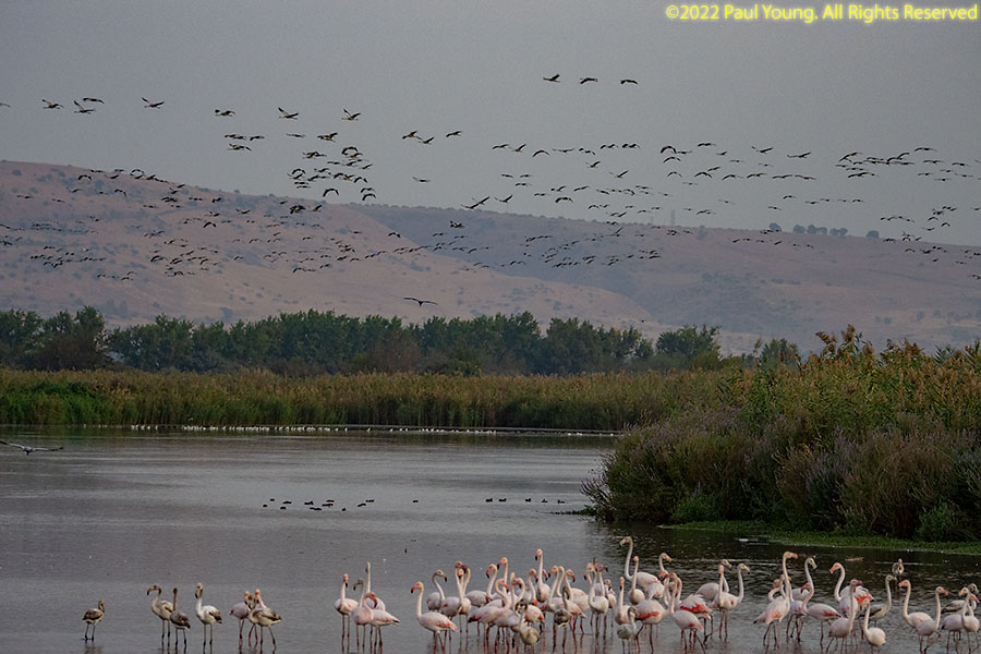 Hula Lake Park, north of the Sea of Galilee, lies in the center of the Hula Valley in the Upper Galilee bordered by mountain ranges, the Golan to the east and the Naphtali Range to the west. More than 500 million birds, waterfowl, birds of prey, and songbirds of 390 species including twenty globally-endangered species, migrate through this area of the Hula Valley in the spring and fall.