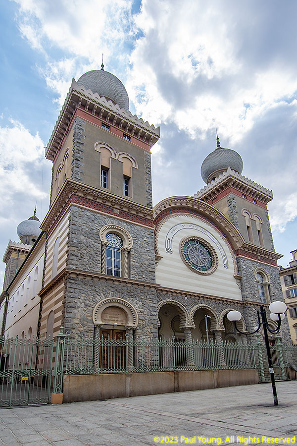 The Great Synagogue of Turin was designed in the Moorish style and opened in 1884. It wa severely damaged by bombing in 1942 and was rebuilt in 1949. It can seat 1400 people.