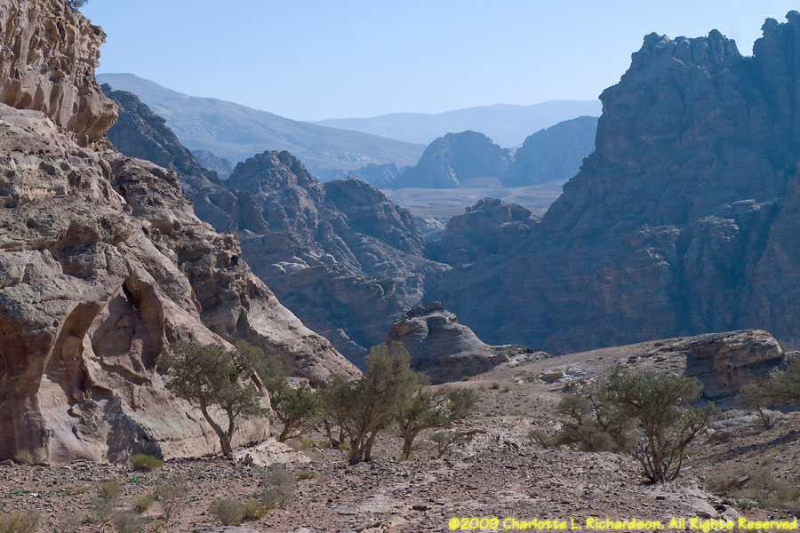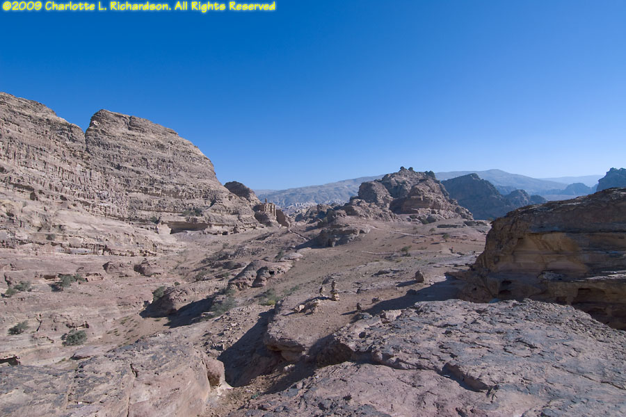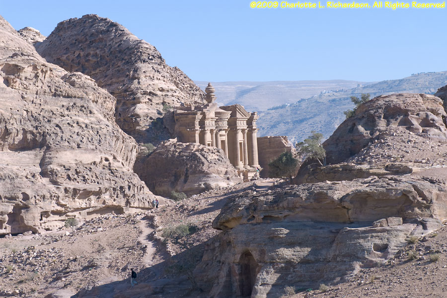 Up into the mountains to Al-Deir (the Monastery), built in the 3rd century B.C.E. as a Nabataean tomb, with view of Aaron's Tomb on Mount Hor (Jebel Haroun) and Wadi Araba: