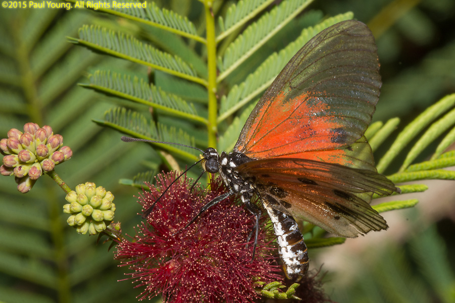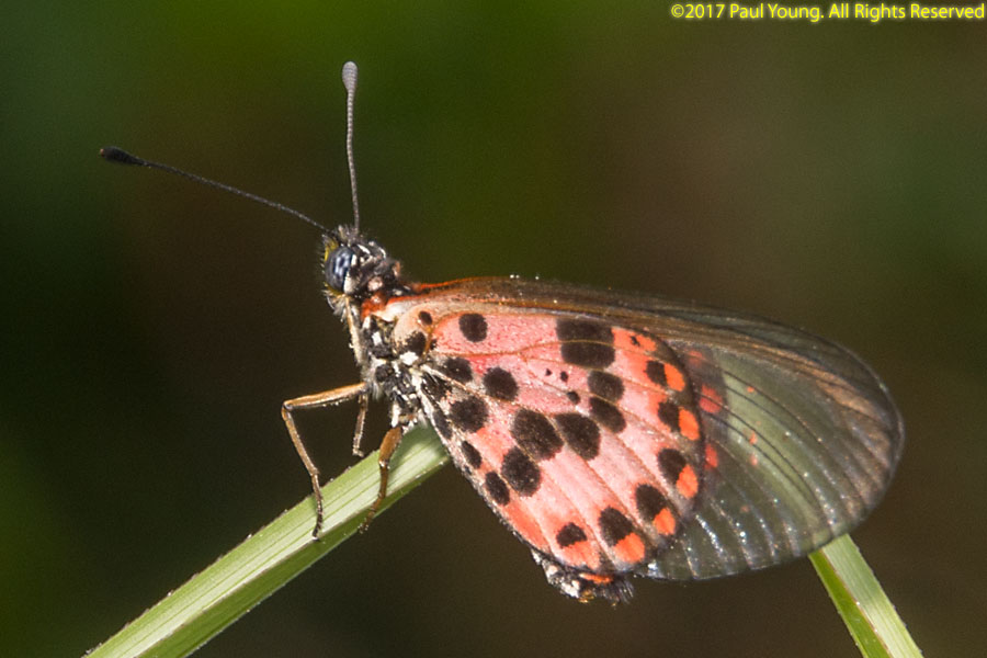 Acraea lia, found in Madagascar, Comoros, Mayotte, and Ajouan in grasslands.