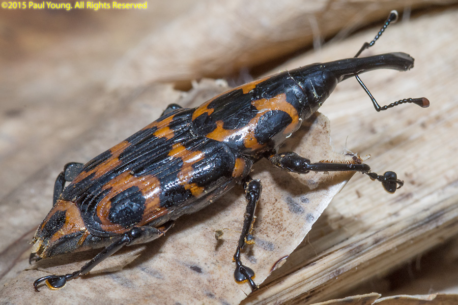 The giraffe weevil, Trachclophorus giraffa, is endemic to Madagascar. The neck of the male is two or three times longer than that of the female and is used in nest bulding and fighting.