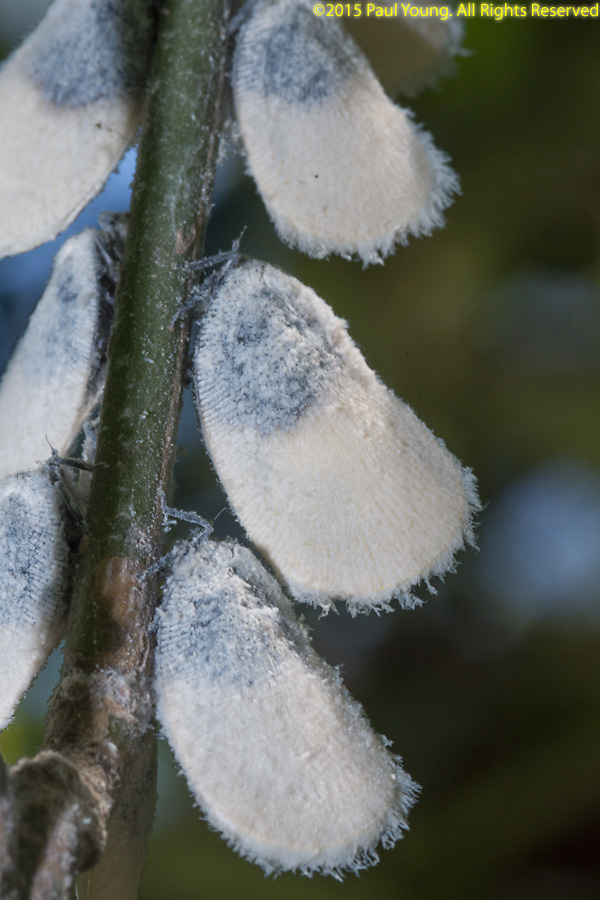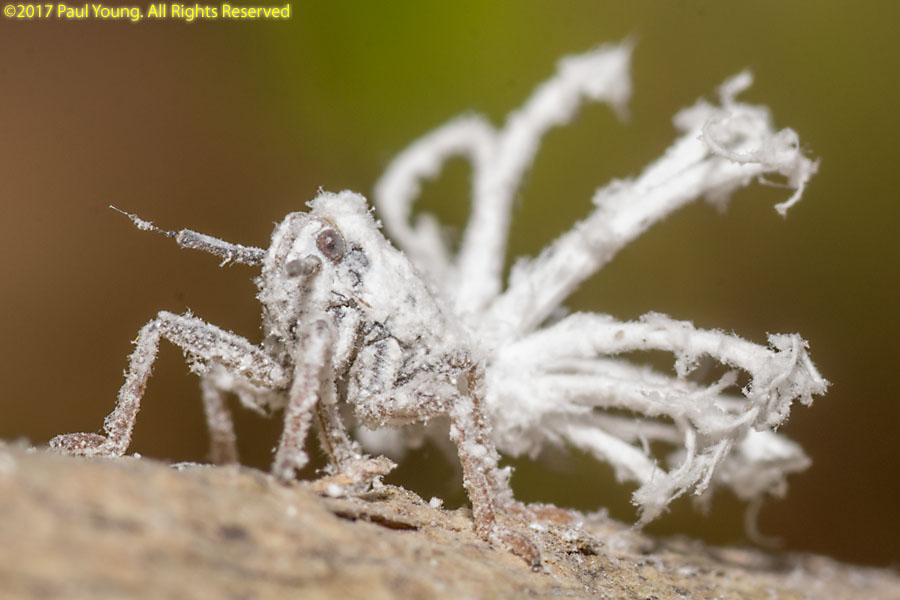 Flatid leaf bugs, Phromnia sp., adults and nymphs. The nymphs exude a white waxy substance that grows up from the animal like wispy feathers.