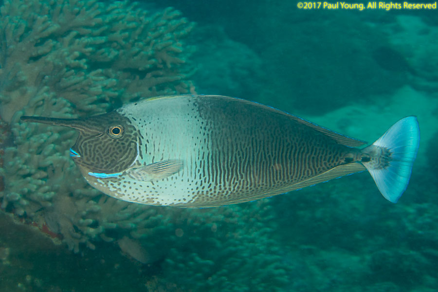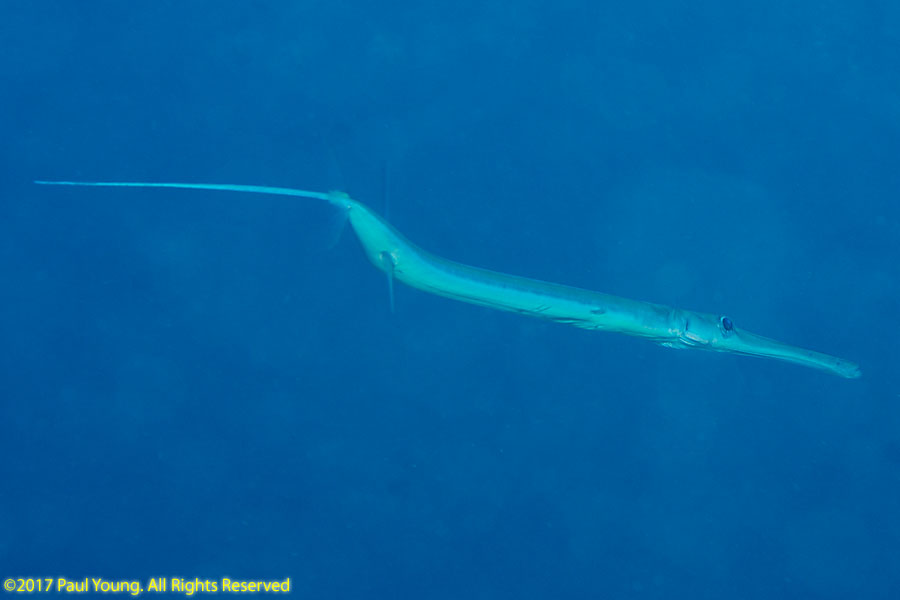 The blue-spotted cornetfish, Fistularia commersonii, is common on sand slopes and coral reefs in shallow water.