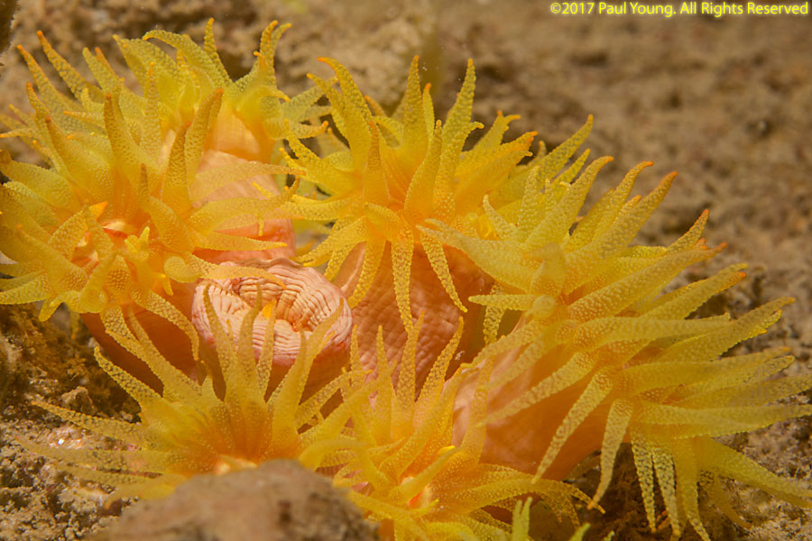 Tube anemones (tube-dwelling anemones, ceriantharians) look like sea anemones but are not closely related. They are solitary and live buried in soft sediments. The tube, into which the animal can withdraw, is made of mucus and threads of phychocysts. The crown of tentacles has two whorls. The large outer tentacles are used to capture food, and the inner ones to manipulate and ingest it.