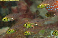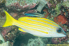 There are four families and eight species of remoras found in tropical and subtropical waters. Four are found in the Maldives. These two are the most common. The grey ones are short suckerfish (live sharksucker), Remora remora. The striped one is slender sharksucker, Echenis naucrates. Remoras have a sucker disk on top of the head which evolved from a spinous fin into a series of laminae.
