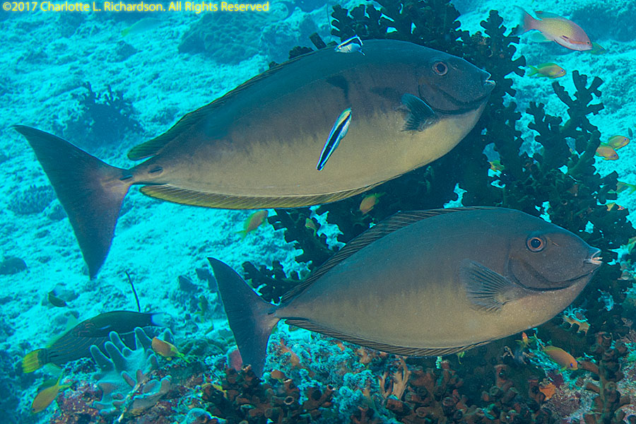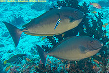 Spotted unicornfish, Naso brevirostris (female left, male right)
