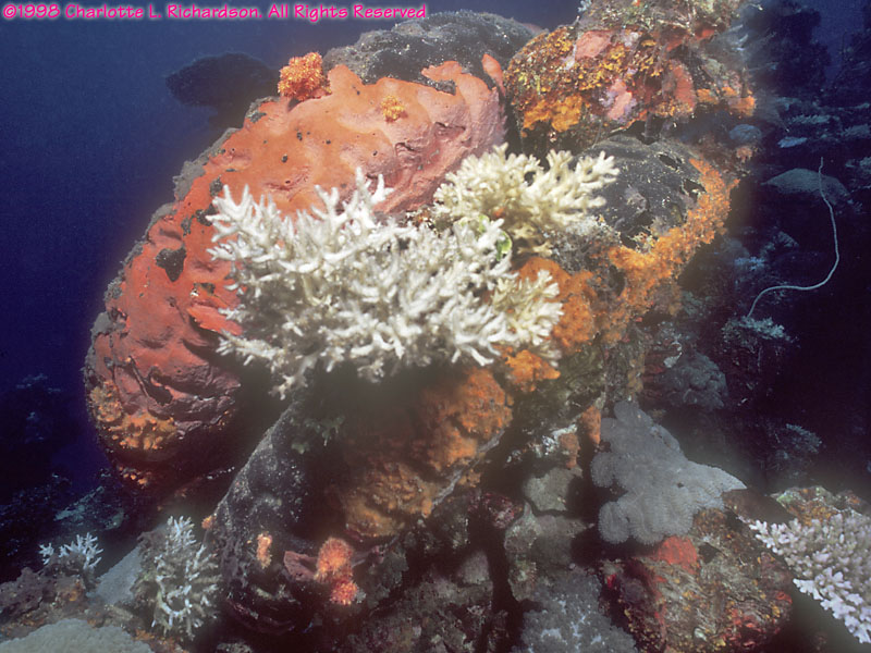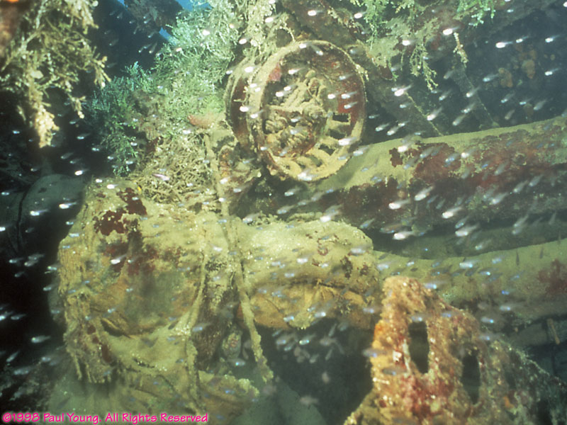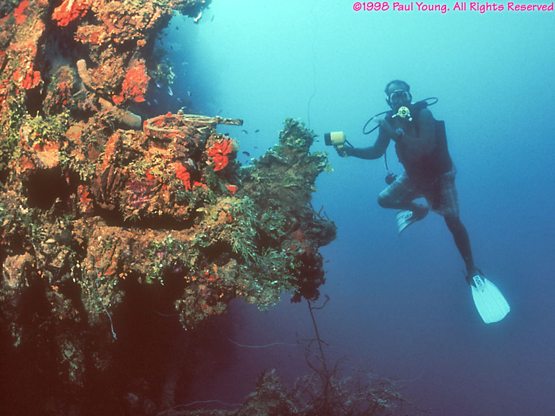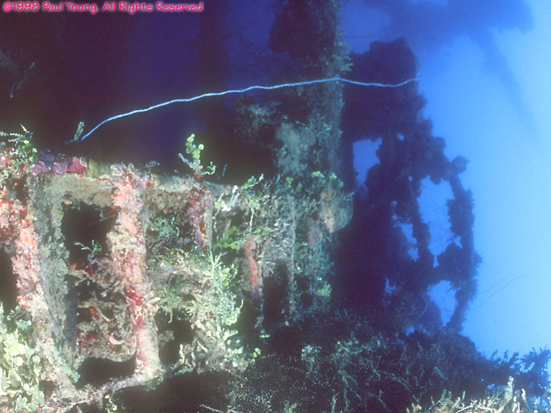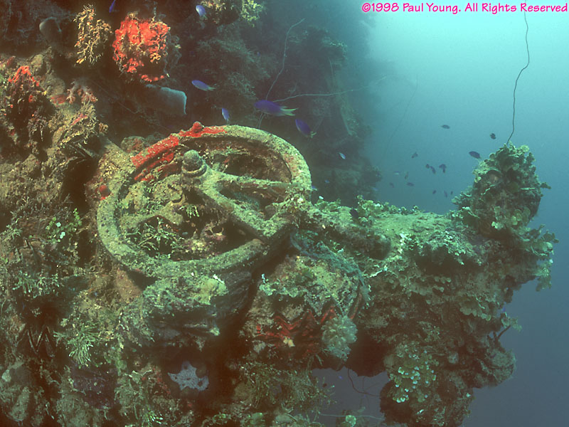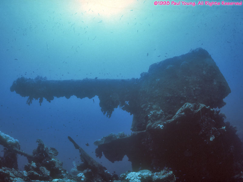 Fujikawa Maru: The most spectacular wreck we dived, the Fujikawa Maru is a 436' armed aircraft ferry with large deck guns and lots of cargo, resting upright with the deck at 50' and the stubs of two masts exposed, near Eten Island.