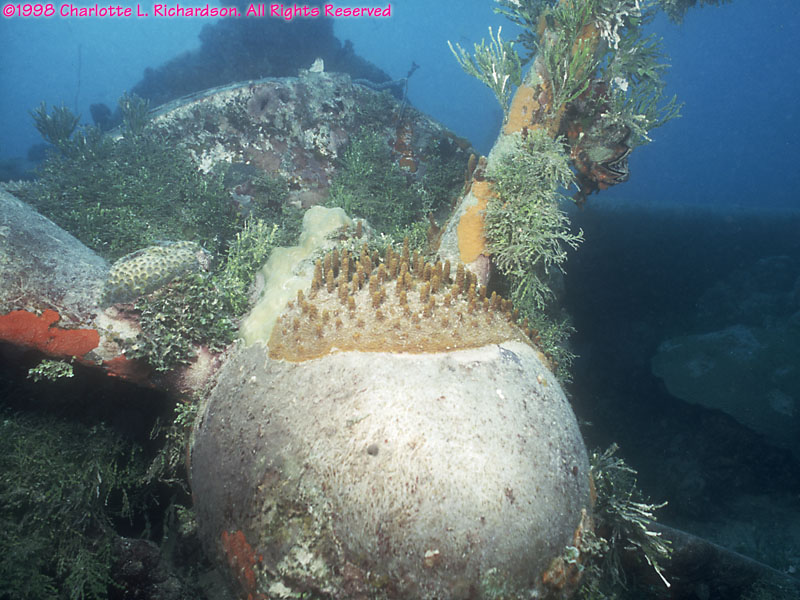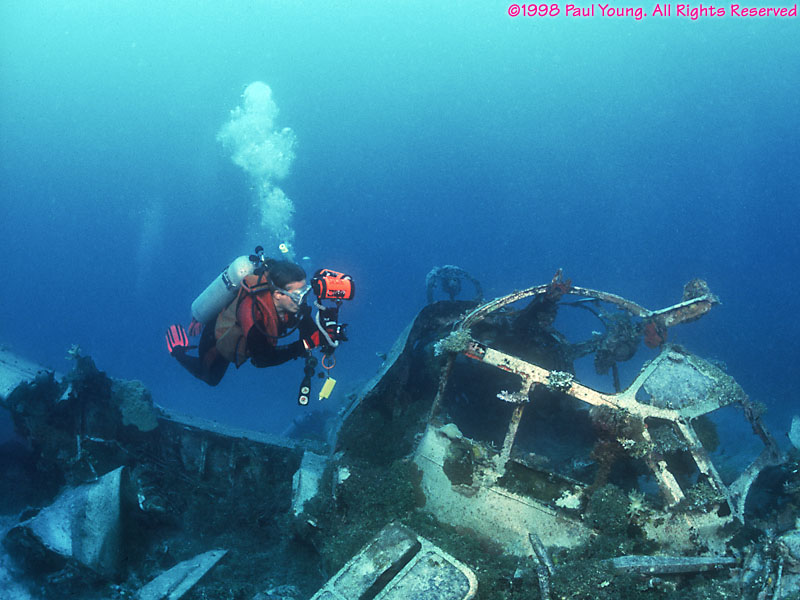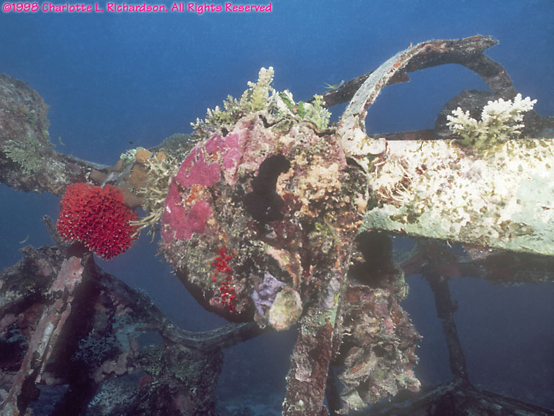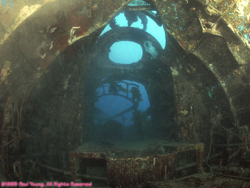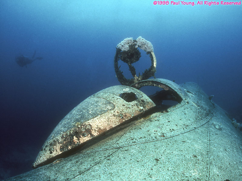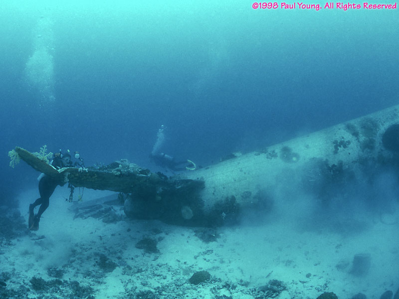 Emily Flying Boat: very large airplane lying upside-down at 50' off Dublon Island.