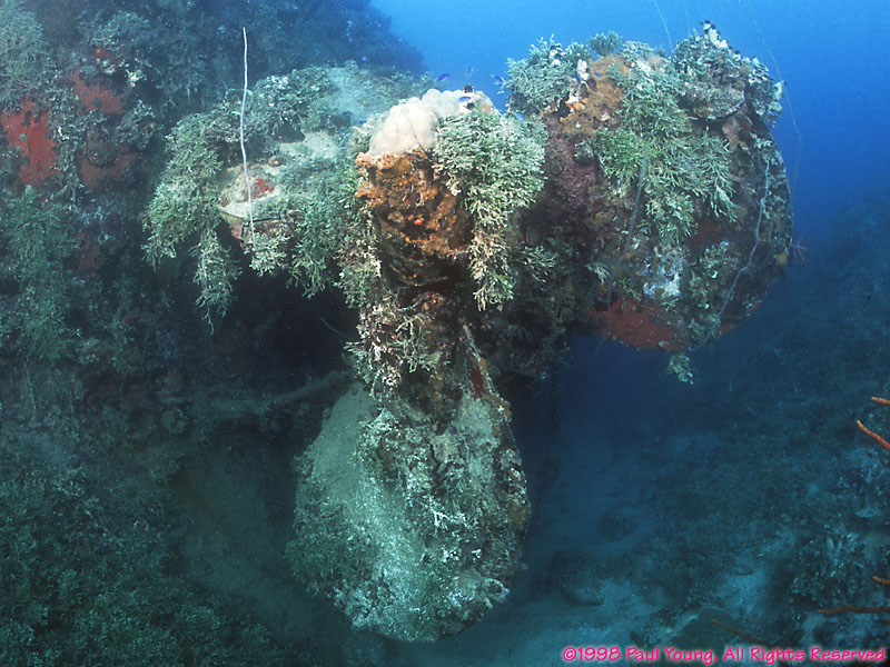 Heian Maru: Largest ship in the lagoon, a passenger ship converted to a sub tender, lying on its port side at 110' off Dublon Island.