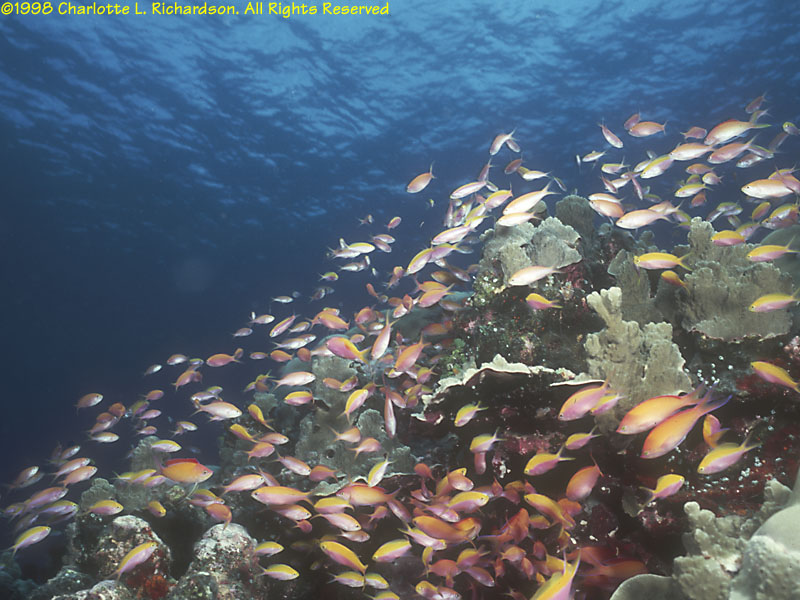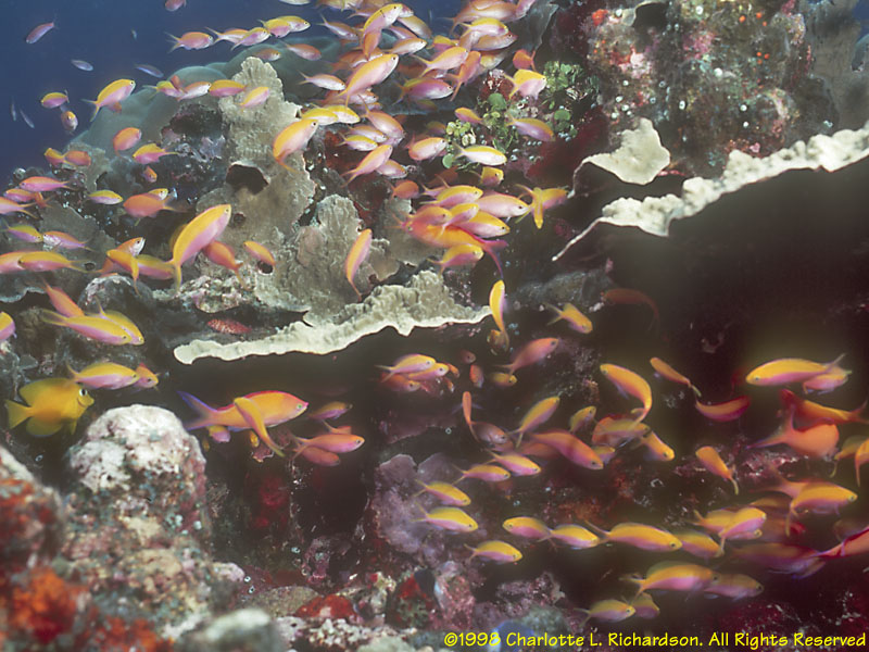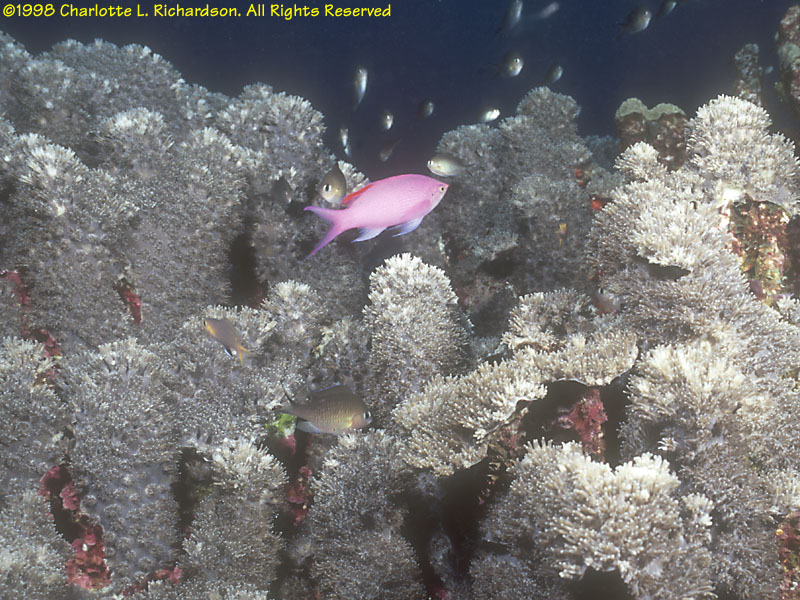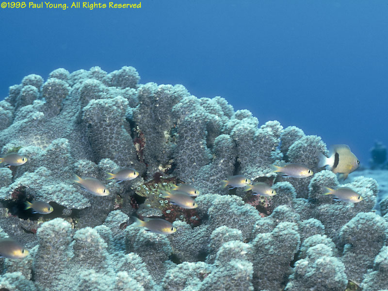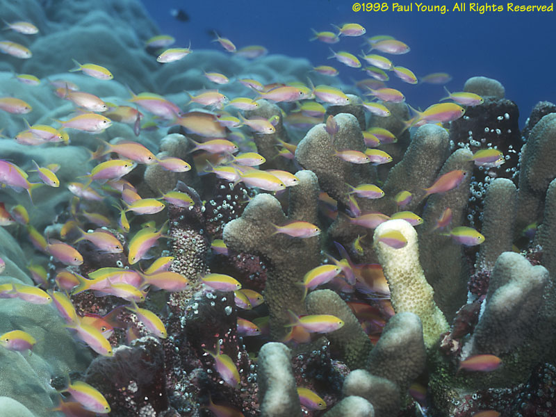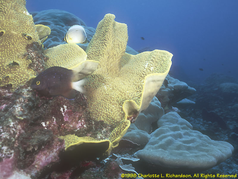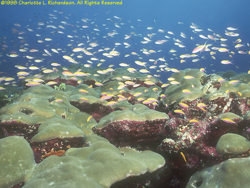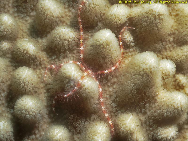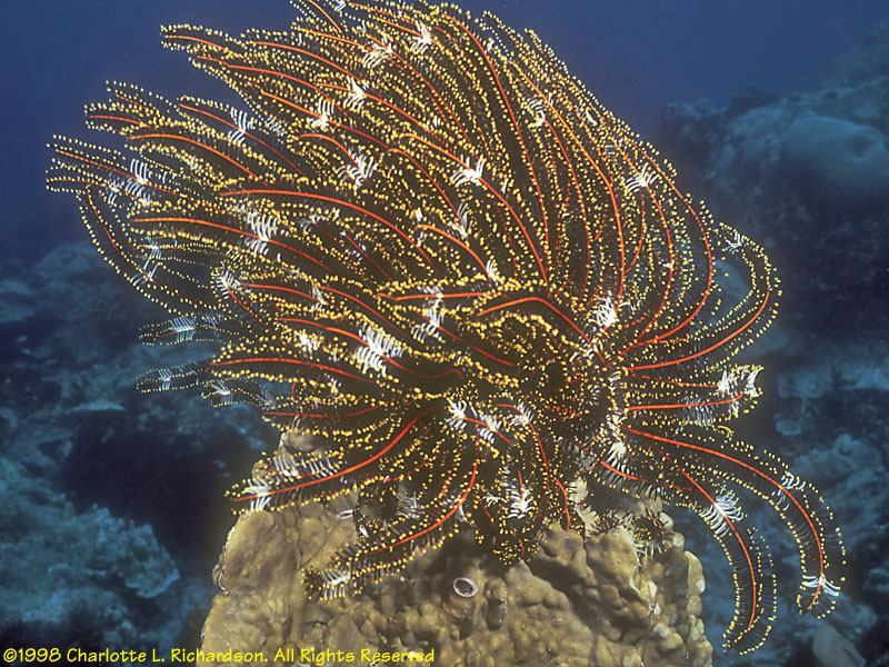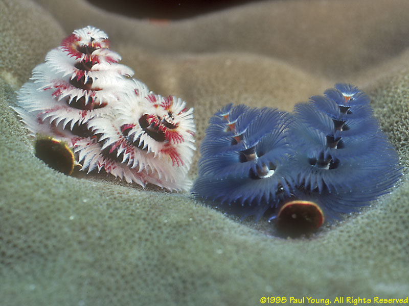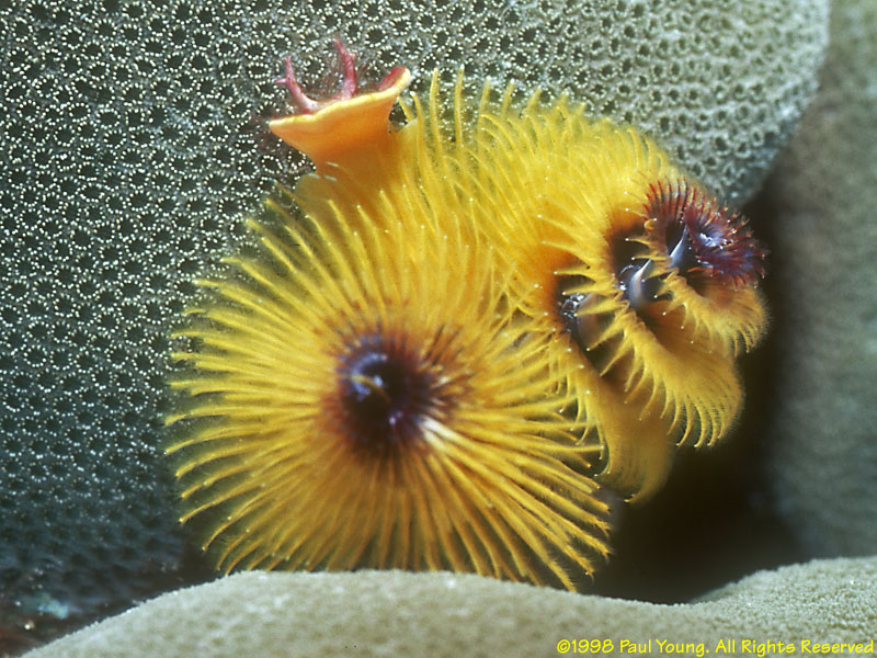 The hard coral heads house huge numbers of spiral gill ("Christmas tree") worms, Spirobranchus giganteus.