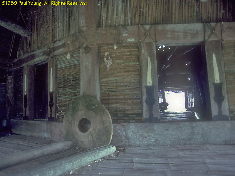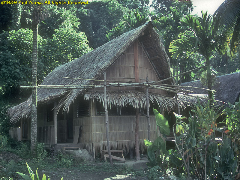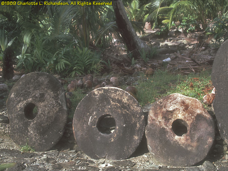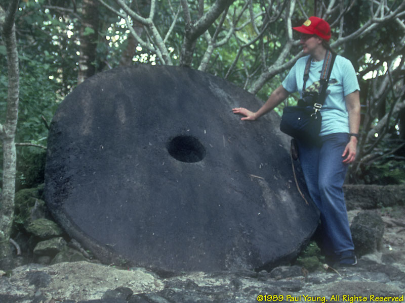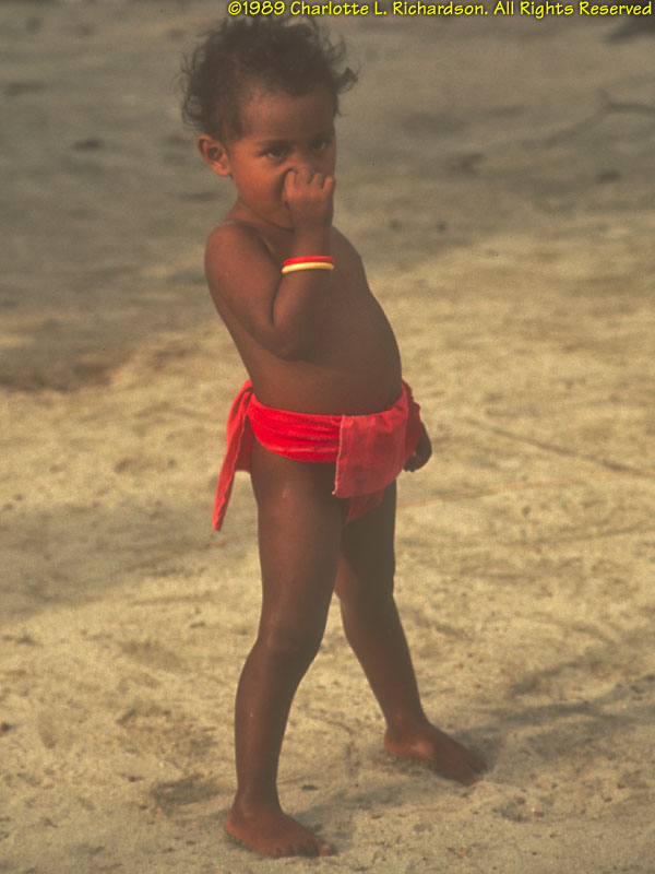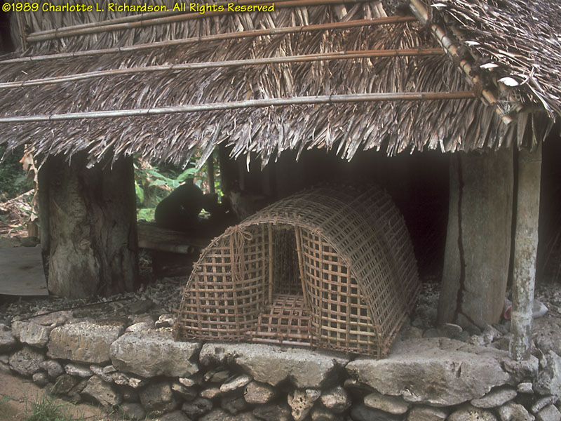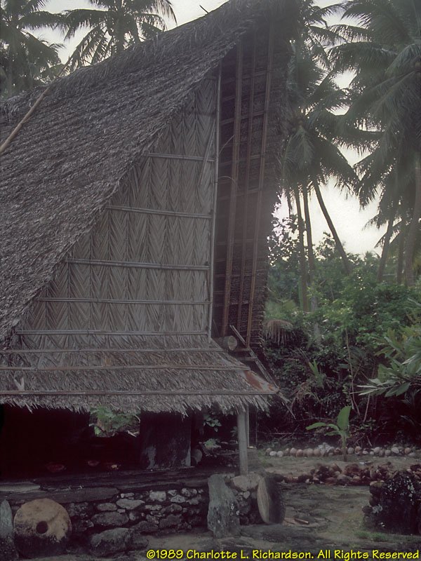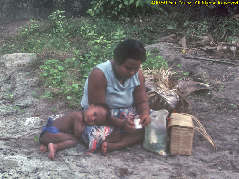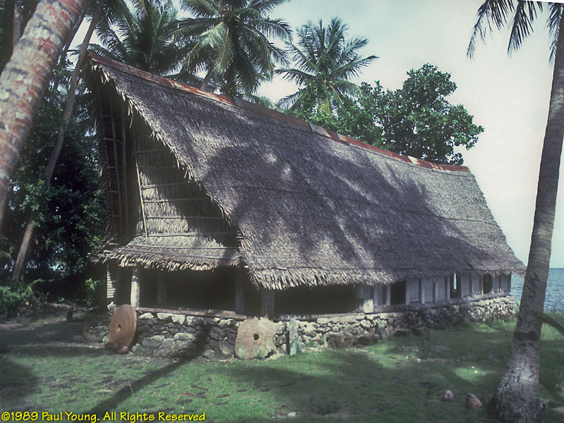 People: At the time of our visit (1989), some older women still wore only grass lavalavas. Seeing that we were obviously foreigners, this older woman addressed us politely in Japanese, which she had learned as a child during World War II! Men and boys wear loincloths. Originally the color of the cloth indicated the island of origin of the family. Yap is the most traditional corner of Micronesia. The Yapese were (and still are, in the outer islands) the greatest navigators of the Pacific