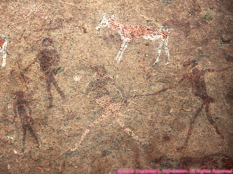 The second panel shows the famous "white lady of the Brandberg", though the image is almost certainly that of a man. Charlotte found the giraffe paintings more interesting, since giraffes are no longer found in this area. There are thousands of bushman paintings in the Brandberg mountains.