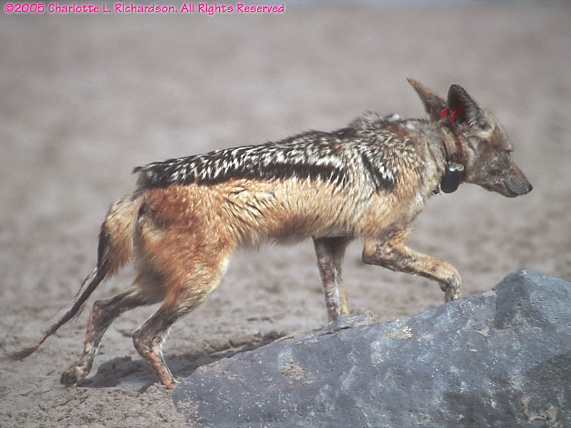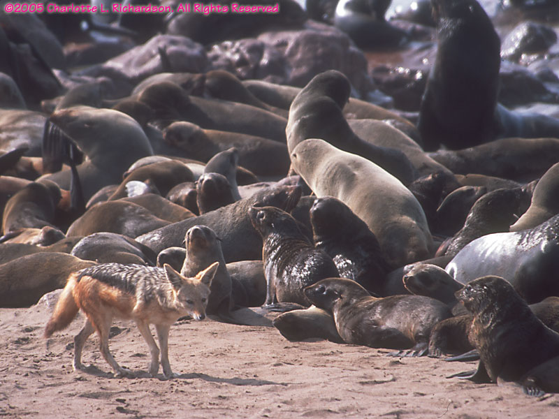 When we visited, the seal colony contained mostly females and a few bulls. These are eared seals, like sea lions, and they smell like sea lions. One fur seal was caught in a nylon fishing net. It seemed weird to see black-backed jackals (Canis mesomelas) checking out the pinnipeds, looking for dead pups, afterbirths, and any other edible debris. Someone was studying the jackals, so some of them wore radio-tracking collars.