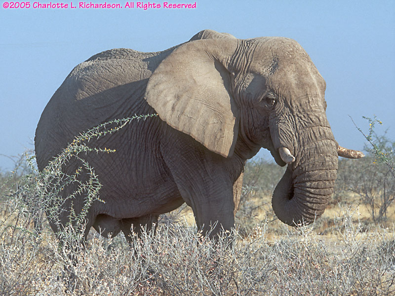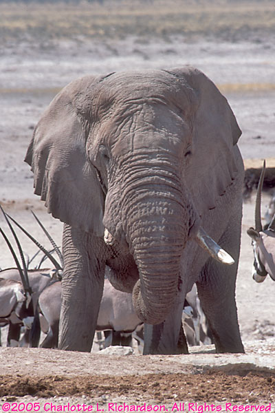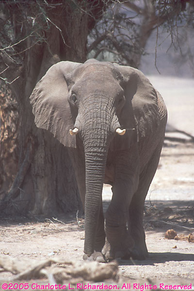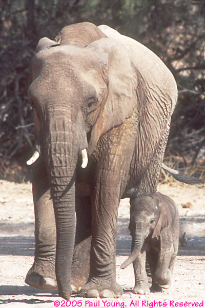These desert-adapted elephants range up and down the mostly-dry river bed checking out waterholes. Even if there has been no water in a particular location for many years, the adults lead the calves there so that the young animals learn the routes to where water may be available.