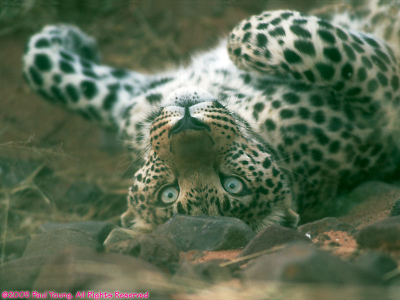 Leopards (Panthera pardus) are fairly common in Namibia, both on ranches and in the eastern part of Etosha National Park, but are hard to spot. This female and cub are at Okonjima (Africat Foundation). We were able to locate them only because the female wears a radio collar.