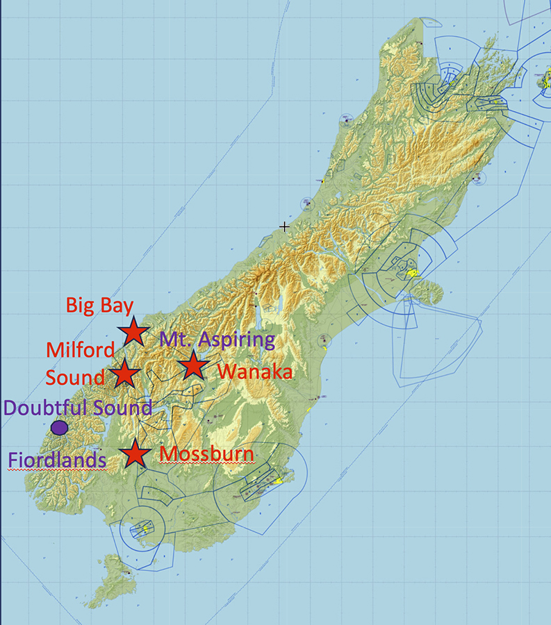 From Mossburn I flew west over the Fiordlands, including Doubtful Sound (Patea), then north-northeast to Milford Sound (Piopiotahi), which we had visited by car and ship a few days earlier.