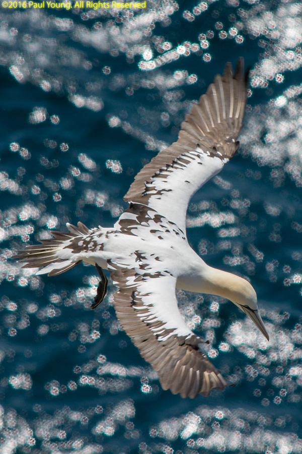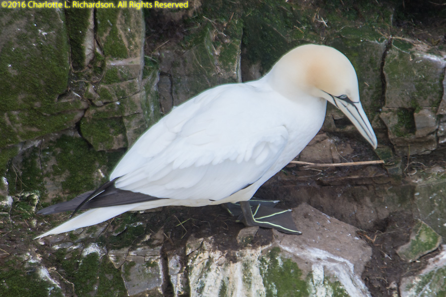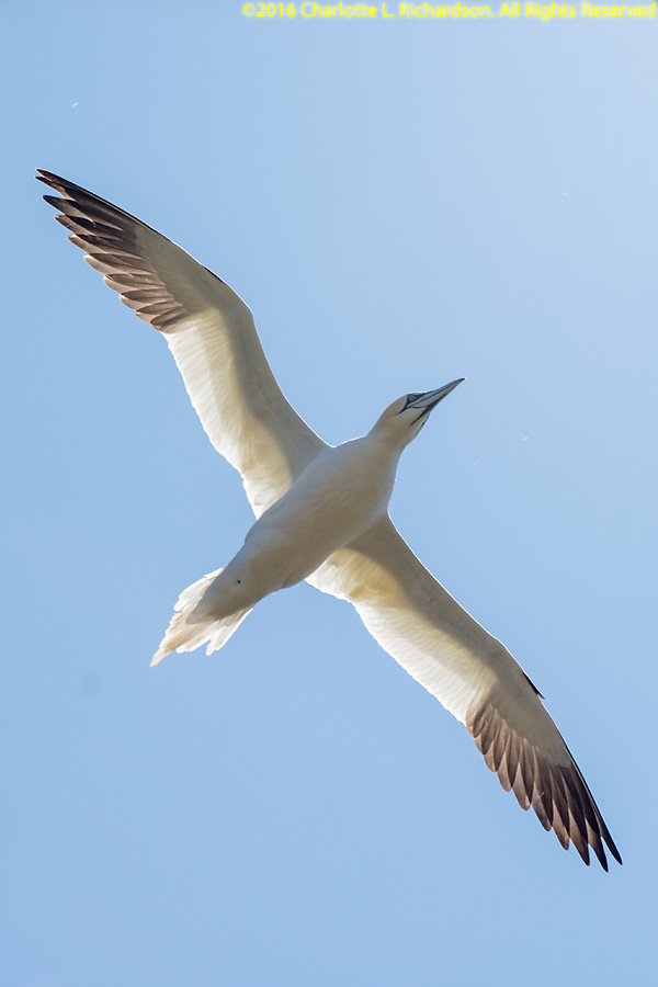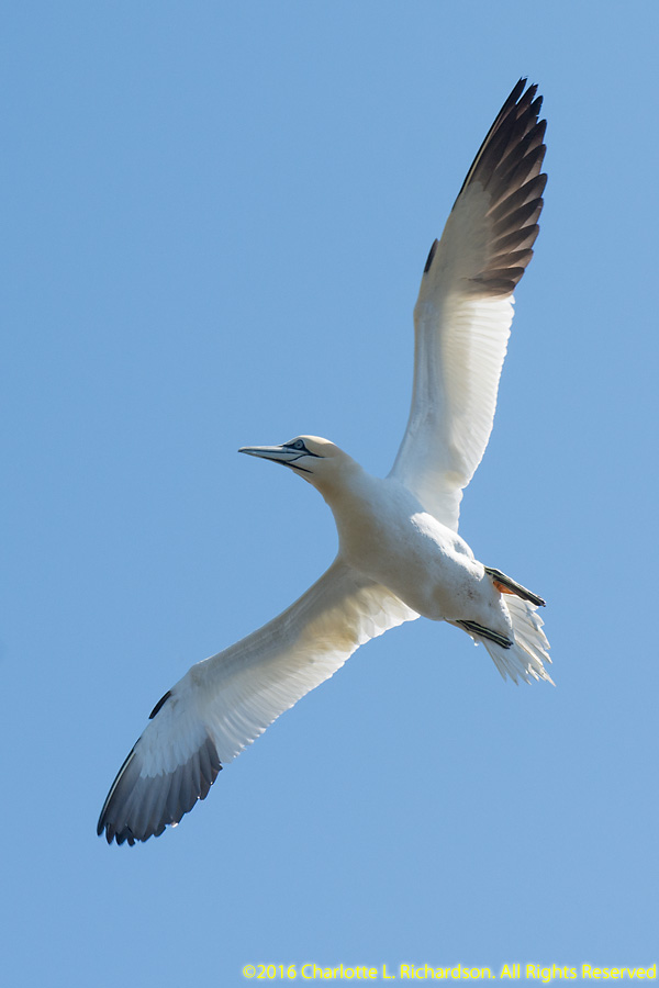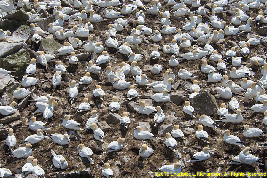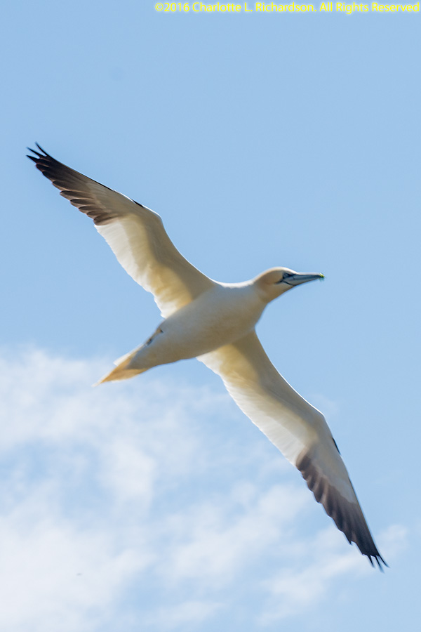 The Northern gannet, Morus (Sula) bassanus, is the largest gannet. The other two Newfoundland colonies are on Funk and Baccalieu Islands. Northern gannets are related to boobies and nest on both sides of the North Atlantic in large colonies on cliffs overlooking the ocean. Fledgling birds are brown with white wingtips. They reach the mature color pattern at about age five. Gannets dive vertically into the sea at velocities up to 60 mph. Nests are built of seaweed and other floating ocean debris such as fishing nets.