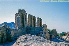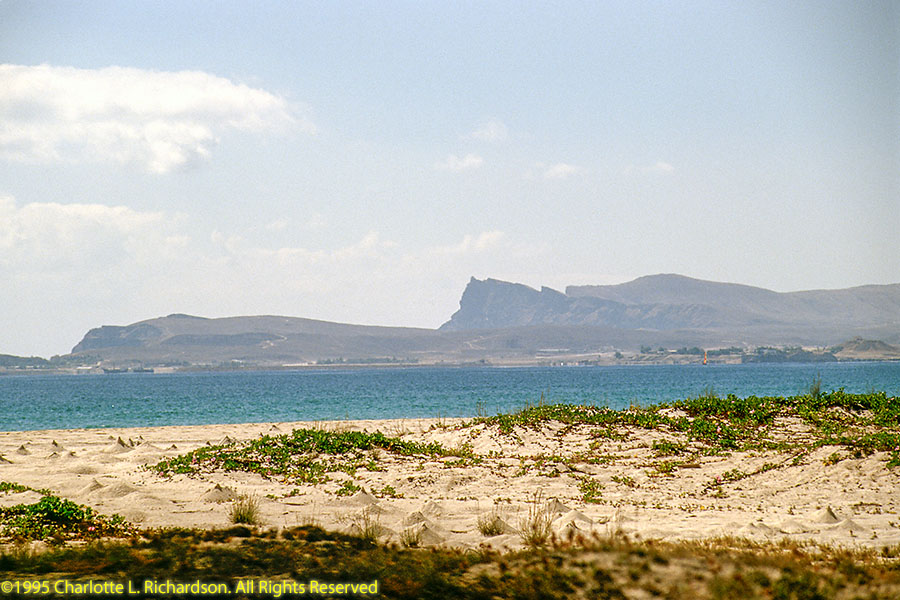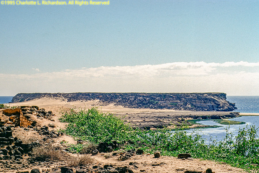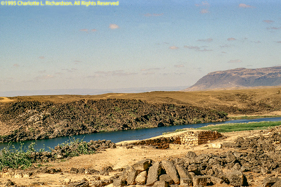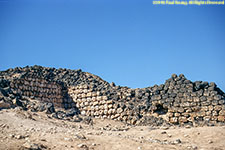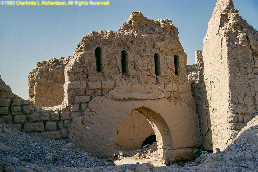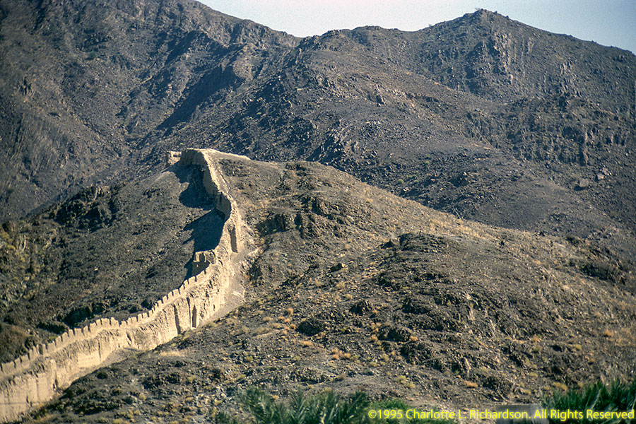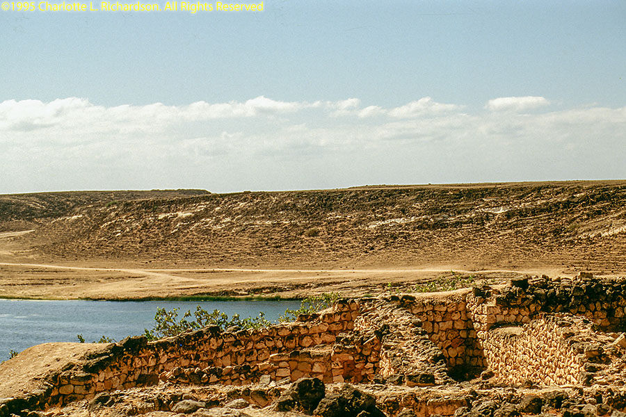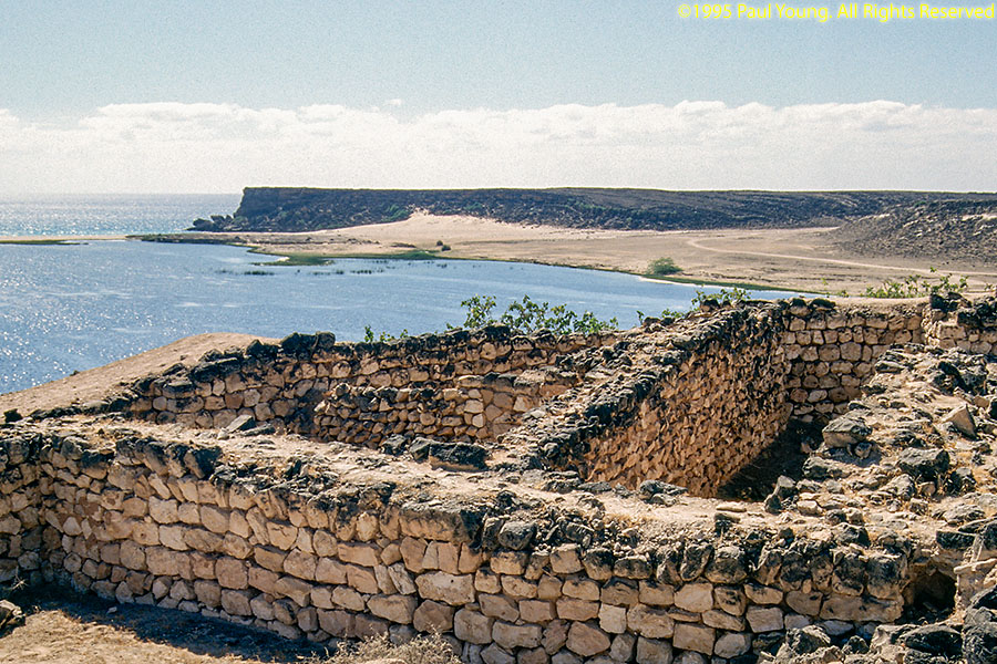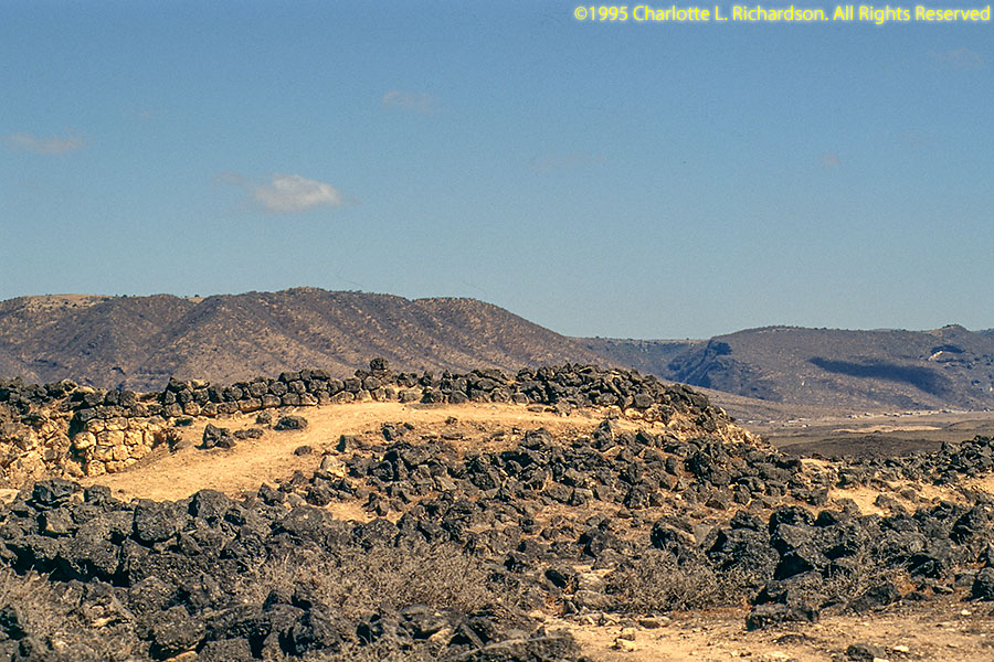 We drove to Khor Rauri to locate the ruins of Samharan. The Tel of Samharan lies only a few kilometers off of the paved road at the head of a beautiful wadi with hills on either side. In anceint times the wadi was deeper and formed a natural harbor, now blocked off by a sand bar. The Tel was surrounded by a protective fence and had at that time (1995) not yet been excavated and lay just as it was discovered only a few years earlier after an extensive search.