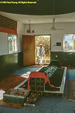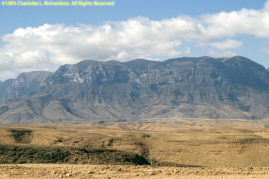 We flew south to Salalah, the capital of Dhofar Province, Oman's second largest city and the birthplace of then-Sultan Qaboos. This corner of Oman catches some of the Indian Ocean monsoons in the fall and is much less barren than the northern part of the country. There are coconut palms instead of date palms, and even banana plantations outside of Salalah. The coastal plain is gravelly and backed by the escarpments of the Jabal Al Qara and Jabal Samhan mountains and high plateau. The terrain of the plateau varies greatly. Some areas are dry grasslands with forests in the wadis and on the slopes of the escarpments.