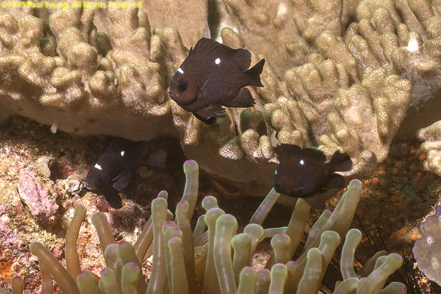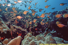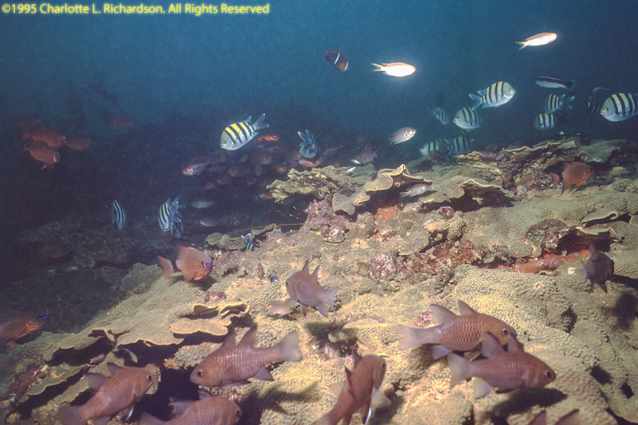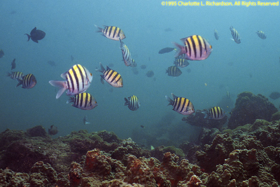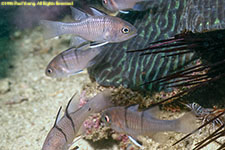 Indo-Pacific sergeants, Abudefduf vaigiensis, and unknown cardinalfish (foreground)
