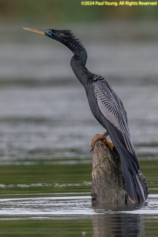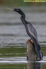 Anhingas are closely related to cormorants. They swim with only the head and neck visible above the water.