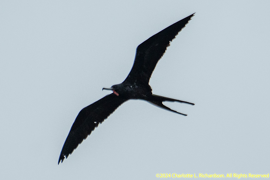 Frigatebirds harass other flying birds into dropping their catch, which they then scoop up in flight. Male birds have an inflatable throat pouch used in courtship display.