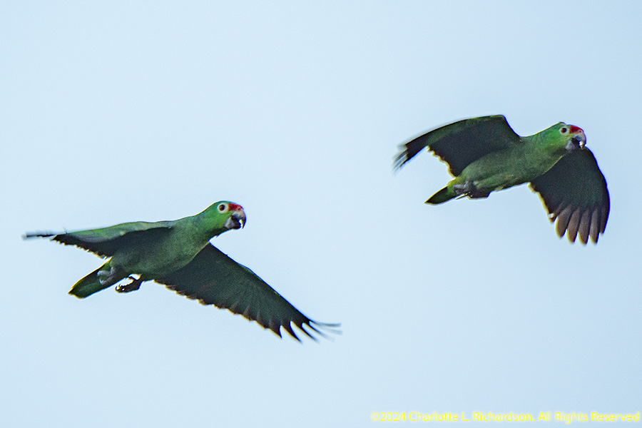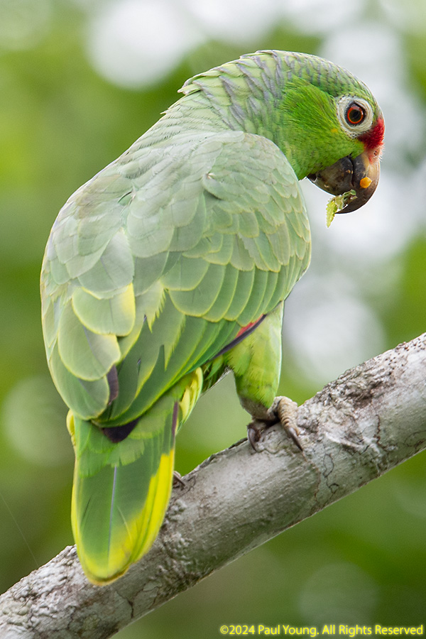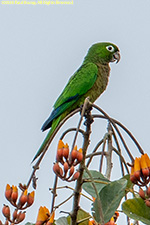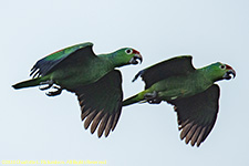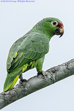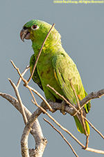 Parrots: Nearly half of the world's 332 parrot species live exclusively in the Neotropics. 22 species occur in Panama. Many are predominantly green with patches of red, yellow, or blue. They usually nest in tree hollows. Parrots use their strong stout bills to feed on fruits and nuts, often holding and manipulating food with their feet.