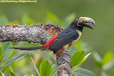 Toucans and aricaris often perch in the open. There are seven Central American species. They are the dominant avian frugivore in Neotropical forests. Their flight is an undulating flap-and-glide. Toucans are related to barbets.