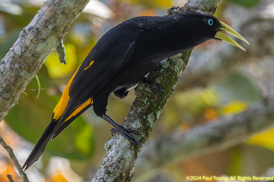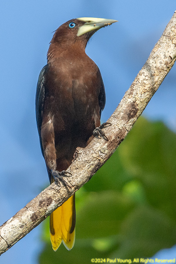 Oropendolas are vocal New World blackbirds found in Central and South America. They are large birds with pointed bills and long tails which are at least partially yellow. They are colonial breeders, building woven basket nests hanging from the tips of branches.