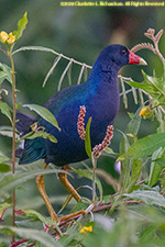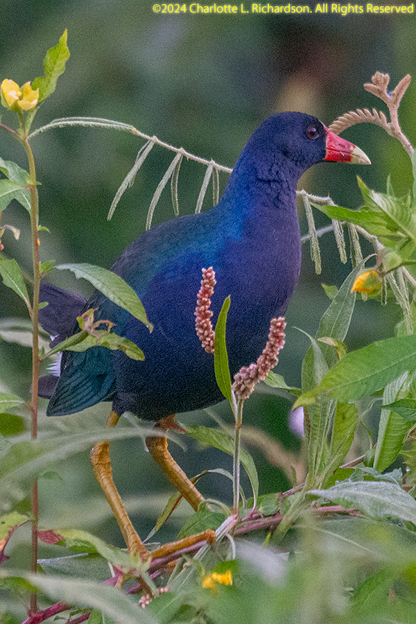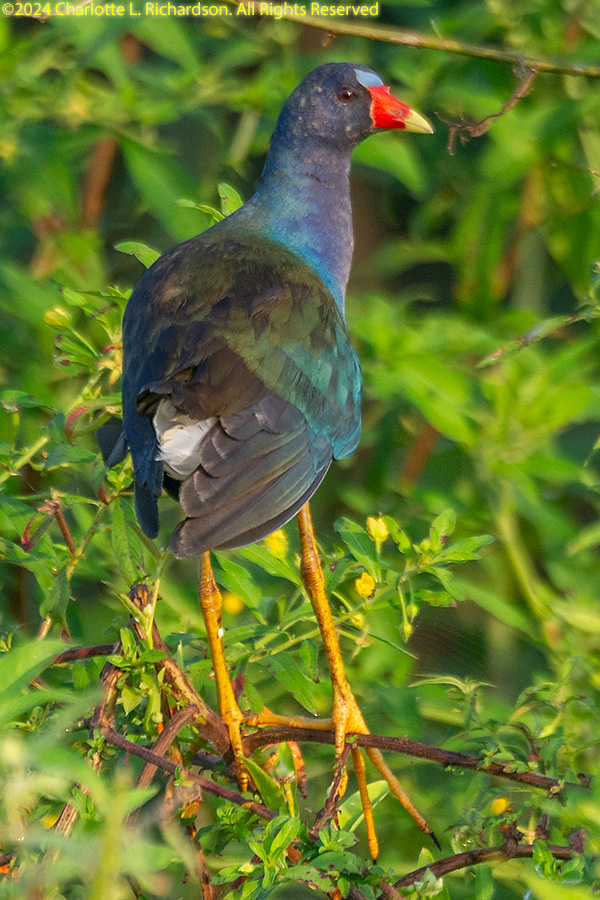 Jacanas and gallinules: The two species of jacanas both have long necks, long yellow bills, frontal shields, and very long toes. Gallinules (moorhens or marsh hens) are medium-sized water birds related to rails and coots. They have short rounded wings and are weak fliers, but have strong legs and long toes.