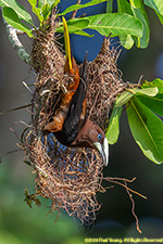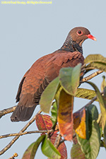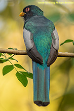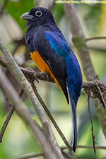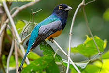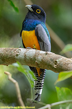 Trogons are related to quetzals. They gnaw holes in trees or termite nests to make their nests, and have broad bills and weak legs.