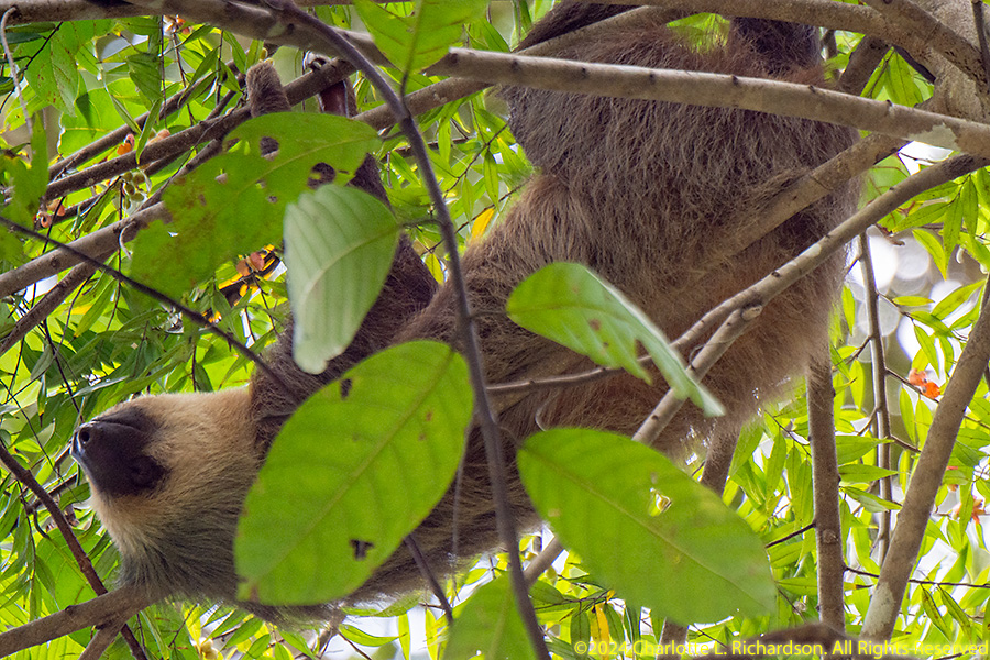 Brown-throated three-toed sloth, Bradypus variegatus. The striped color pattern on its back shows this one is a male.