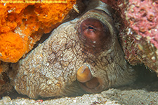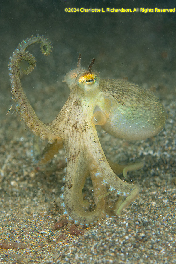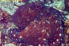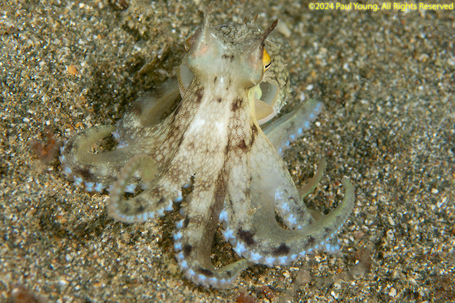 An octopus is a soft-bodied eight-limbed mollusc with two eyes and a beaked mouth at the central point of the eight limbs. They have complex nervous systems and excellent eyesight. The day or blue octopus is the common large day-active octopus in the Indo-Pacific.