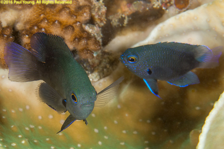 Colombo damsel (juveniles right), Pomacentrus proteus